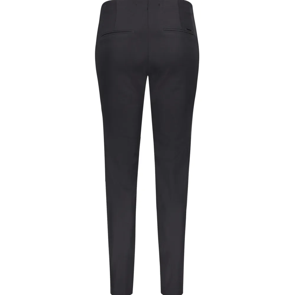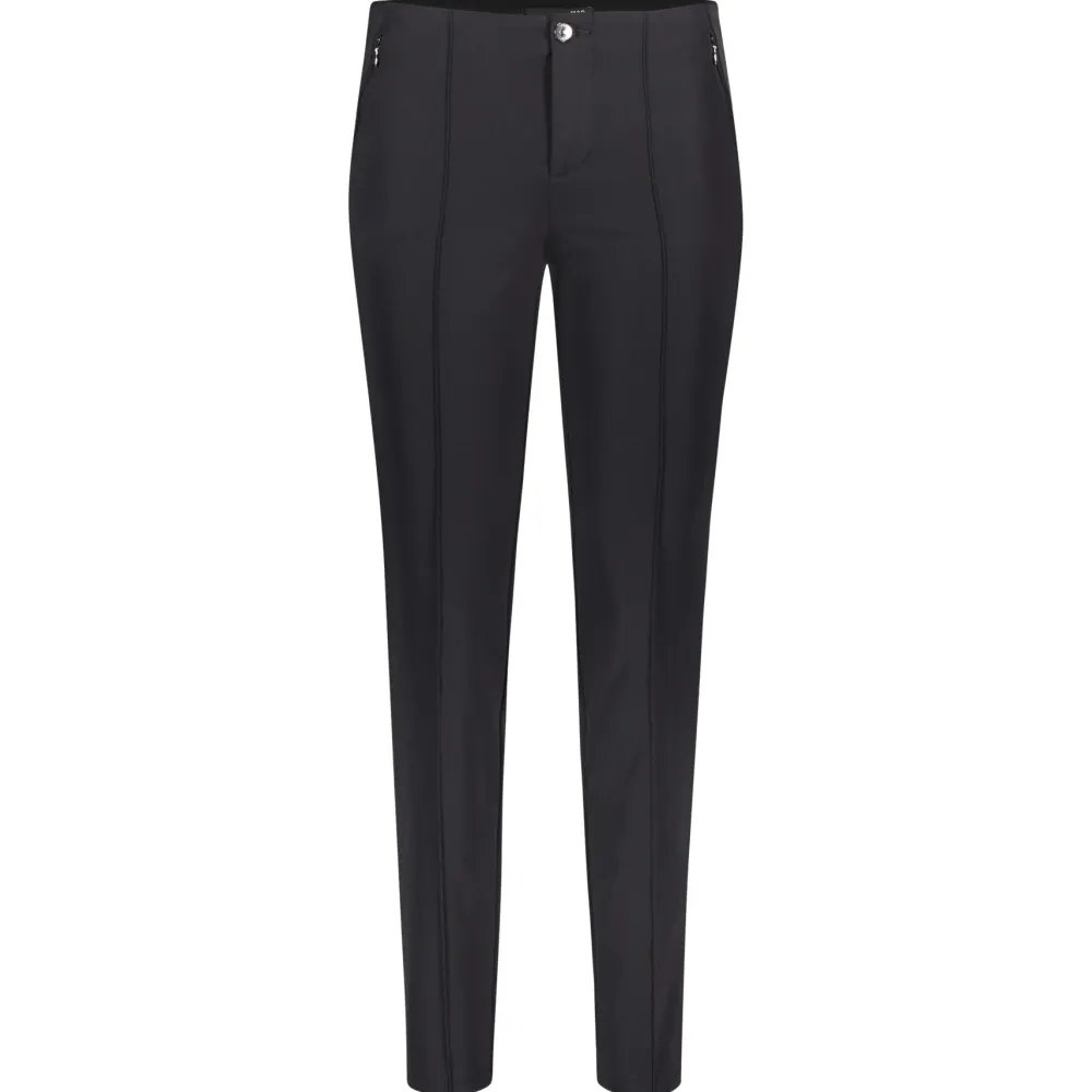 MAC naisten siistit housut, joissa normaali vyötärönkorkeus. Erittäin joustava materiaali tekee housuista helppokäyttöiset ja miellyttävät päällä. Vyötäröllä leveä kuminauha, ei vyönlenkkejä. Edessä nappi ja vetoketjukiinnitys. Kapeat suorat lahkeet, joissa edessä päälleommellut prässit. Vetoketjulliset taskut edessä, takana koristetaskut. Lahkeensuu 30 cm.