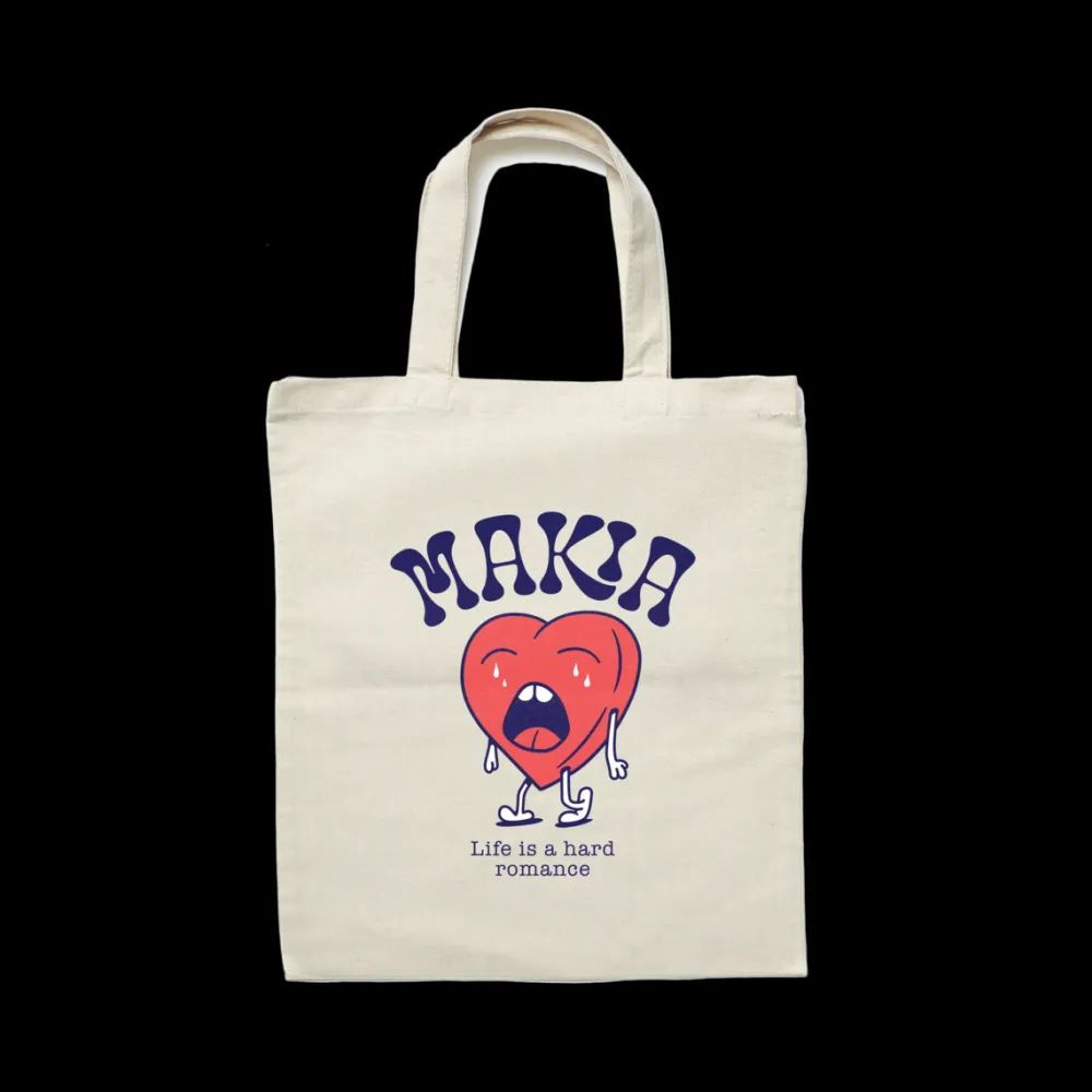 Klassinen kangaskassi, jossa on suuri Heartache-painatus. Valmistettu kokonaan kierrätysmateriaaleista: