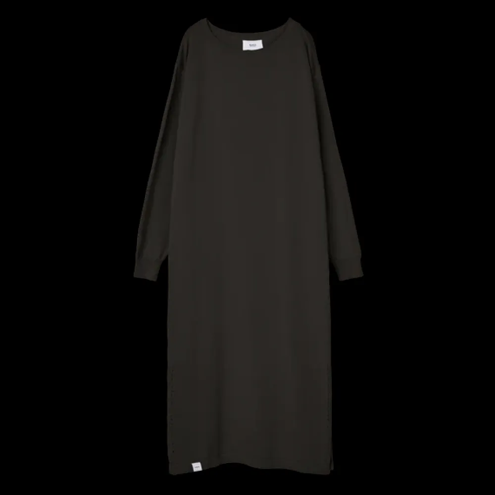 Puolipituinen mekko, jossa normaali istuvuus. Viimeisteltynä venepääntiellä ja ajaur-yksityiskohdilla hihoissa ja helmassa.