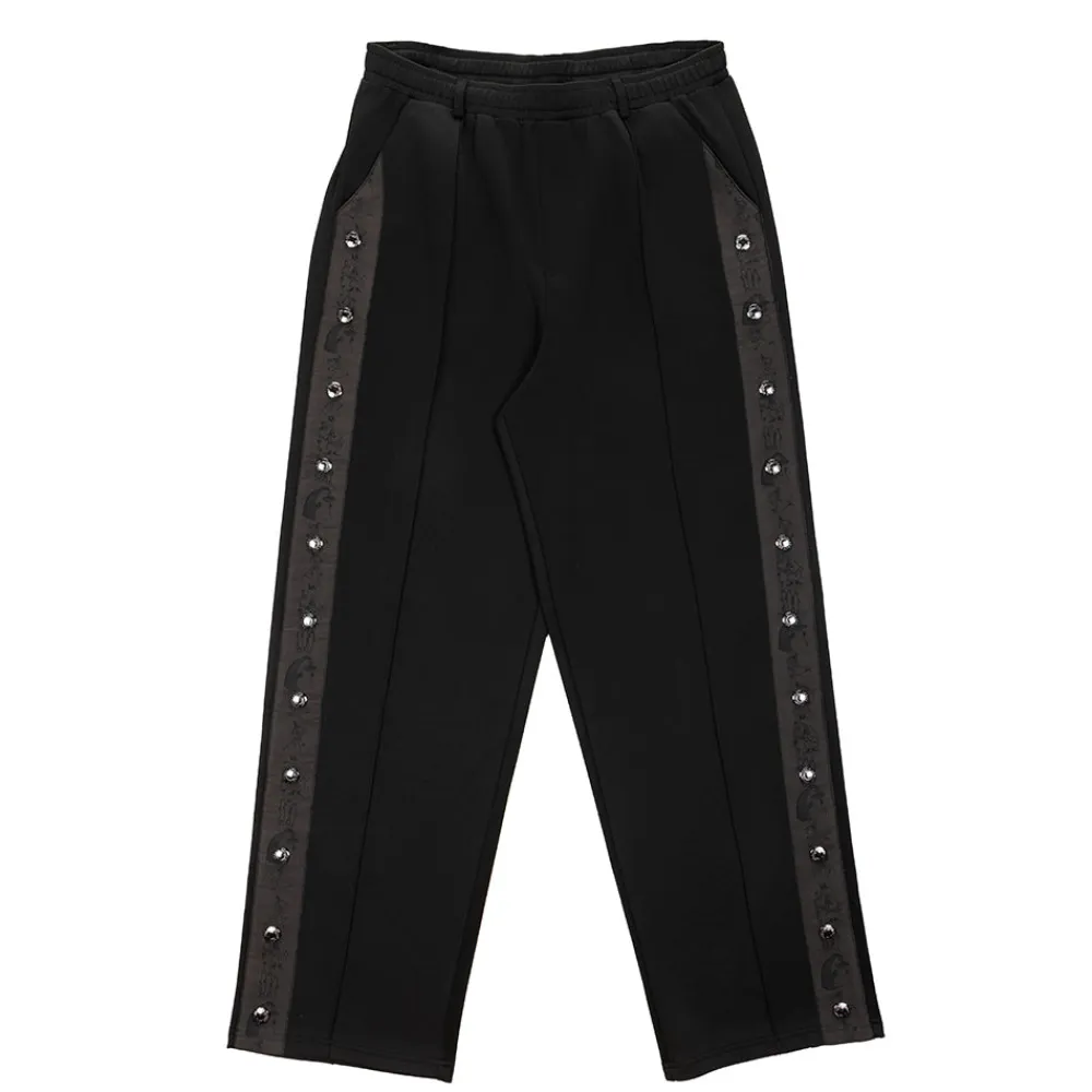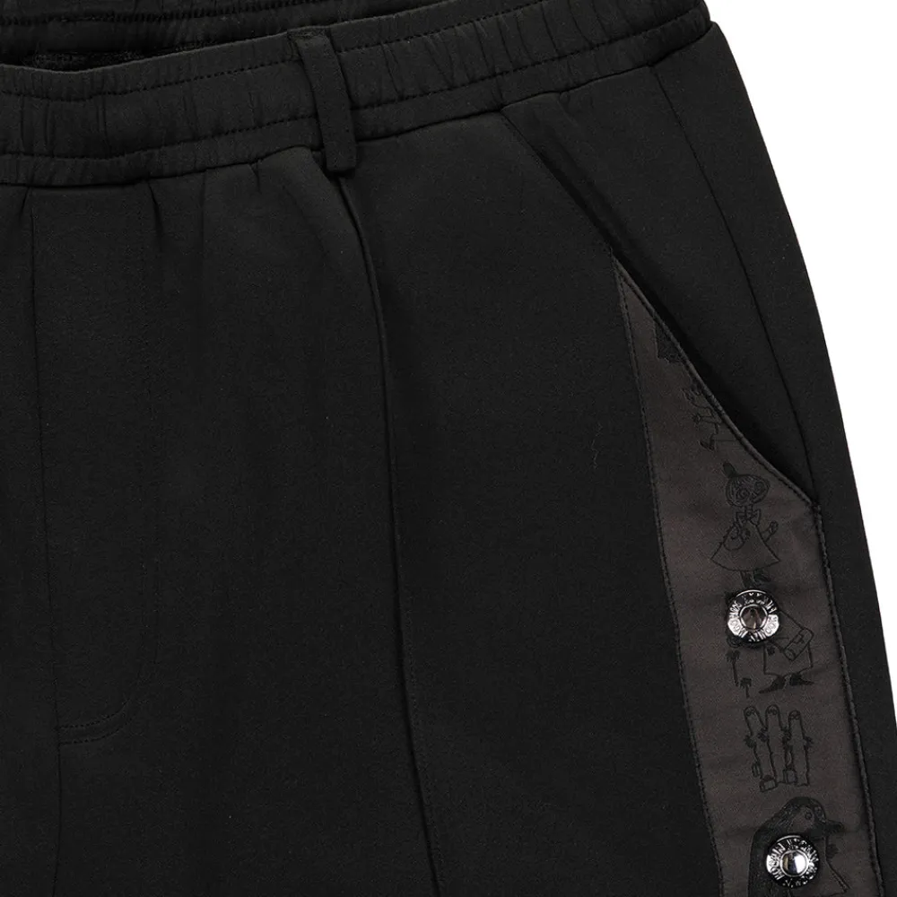 Tyylikkäästi katu-uskottavat aikuisten muumiaiheiset housut. Unifit-mallisissa housuissa on suorat ja väljät lahkeet, joiden sivussa on painonappikiinnitys. Housuissa on vyölenkit vyötäröllä, laskokset ja taskut. Housujen sivupituus koossa S on 115 cm.