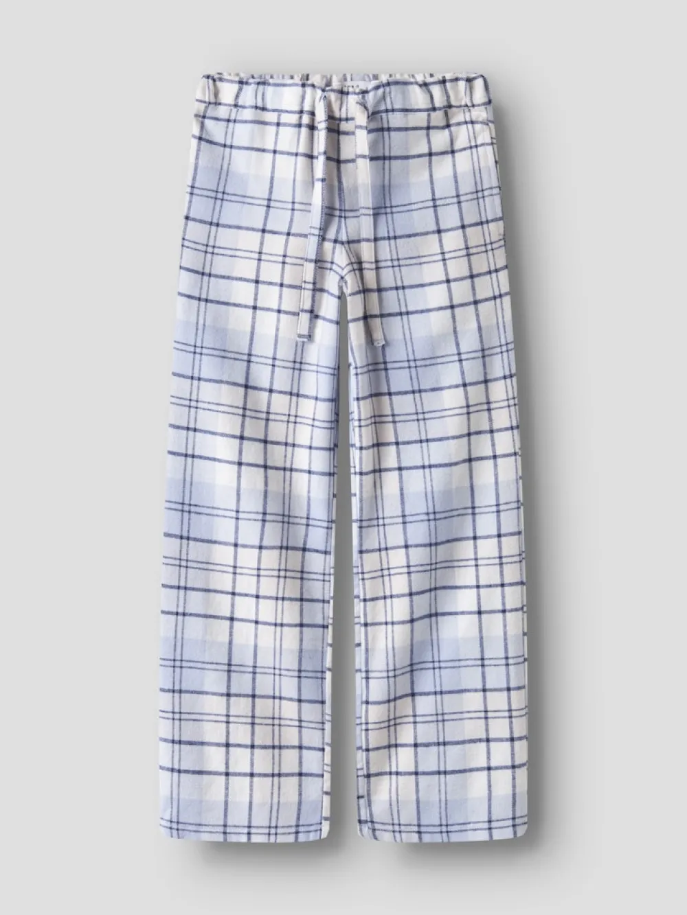 Name Itin ihanan pehmeät ja rennot yöhousut takaavat mukavat illan ja aamun puuhat sekä lempeät yöunet. Housuissa on rento istuvuus ja suorat, väljät lahkeet. Vyötäröllä on säädettävä kuminauha sekä kiristettävä nauha. Pyjamahousut on valmistettu pehmeäksi harjatusta puuvillaisesta flanellikankaasta.