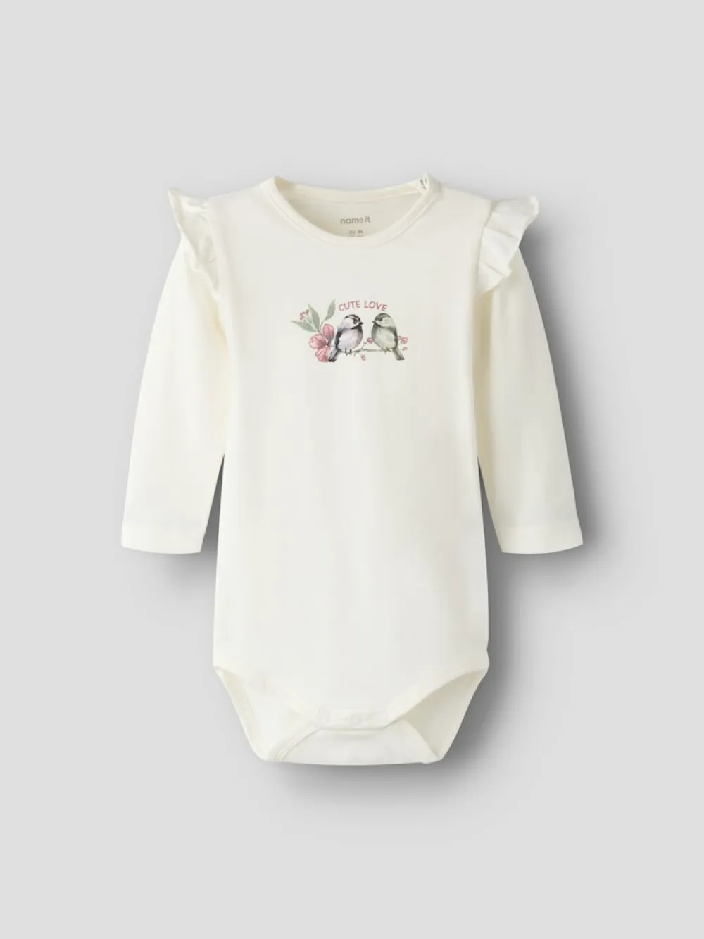 Söpö ja käytännöllinen body linturprintillä, pitkillä hihoilla ja röyhelödetaljeilla. Pehmeä ja joustava materiaali tuntuu miellyttävältä vasten ihoa, ja pitkät hihat tarjoavat lisälämpöä viileämpiin päiviin. Helppo pukea päälle ja yhdistää housuihin tai leggingseihin.