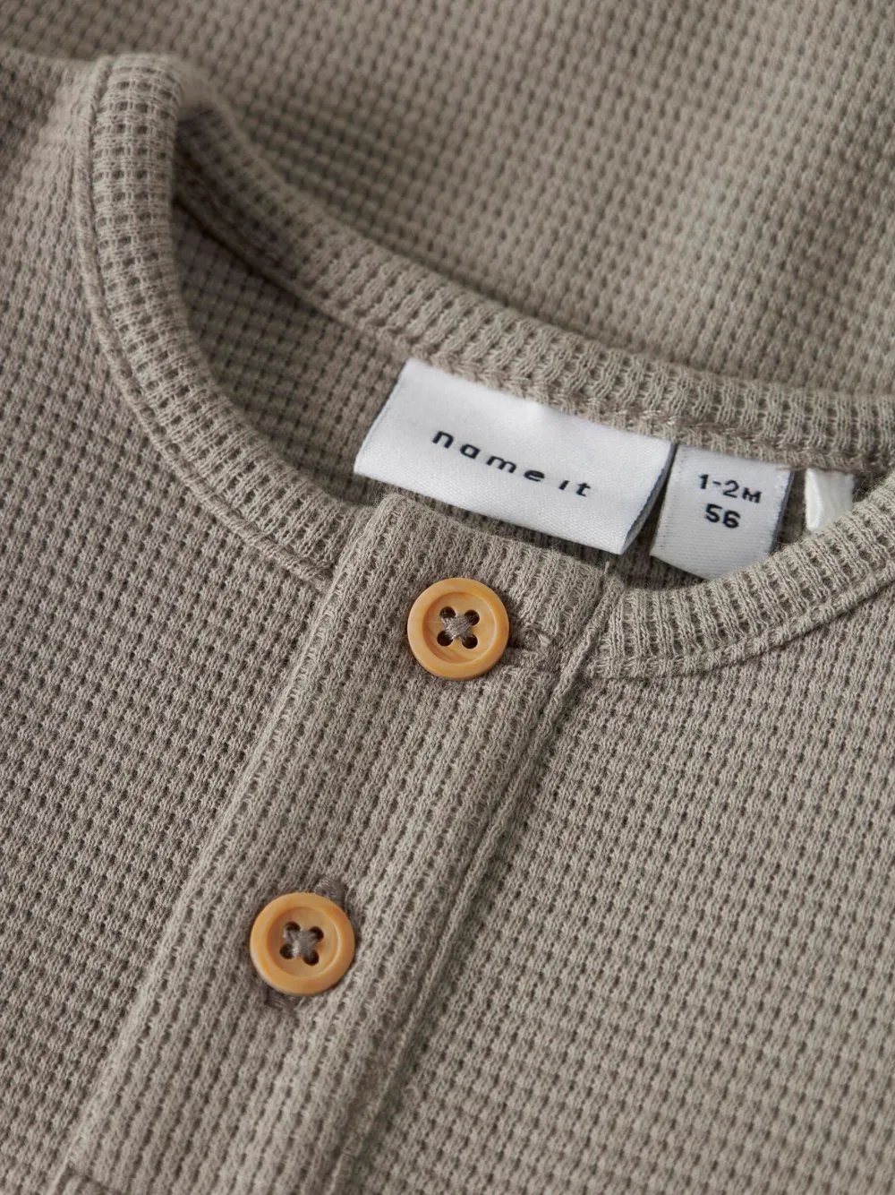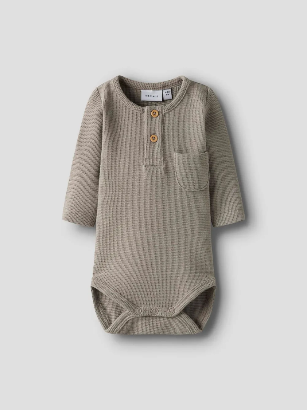 Bodyssa on pyöreä pääntie, pitkät hihat ja käytännöllinen puolinapitus edessä, joka helpottaa pukemista. Haarassa olevat painonapit tekevät vaipanvaihdosta vaivatonta. Rintatasku tuo asuun pienen, tyylikkään yksityiskohdan.