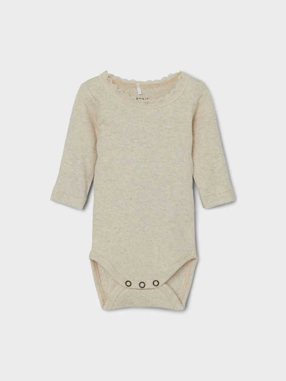 Name It lasten pitkähihaine ribbineulos body. Kiinnitys painonapeilla. Kauluksessa koristepitsiä. Tuotteen valmistuksessa on käytetty luomupuuvillaa.