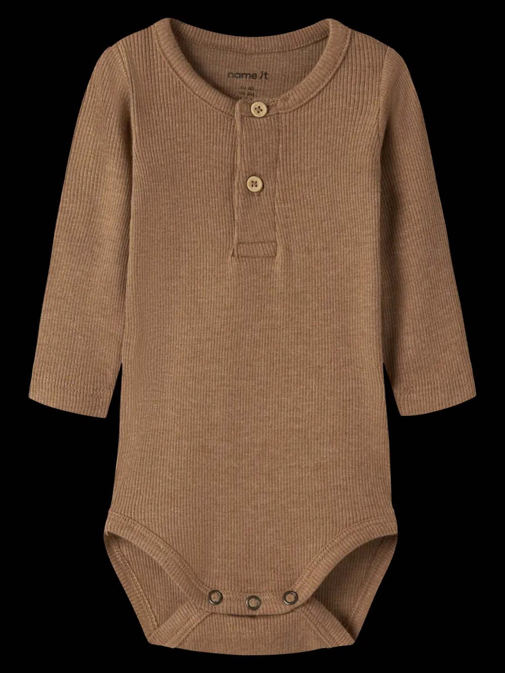 Lasten pitkähihainen body ribbineulosta. Kiinnitys neppareilla haarasta ja edessä pääntiellä nappihalkio.