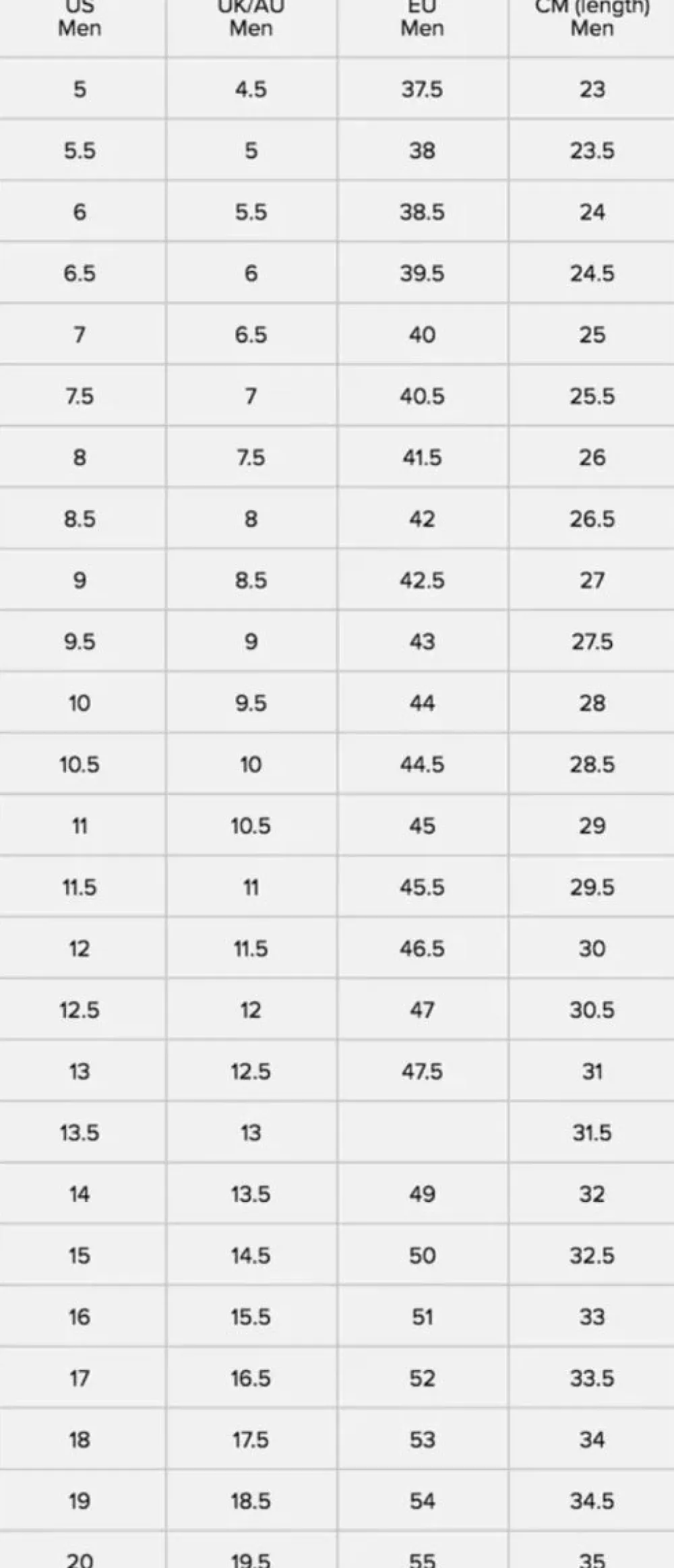 | Size | 4.5 – EU 37, 5.5 – EU 38, 6 – EU 38.5, 6.5 – EU 39.5, 7 – EU 40, 7.5 – EU 40.5, 8 – EU 41.5, 8.5 – EU 42 |
