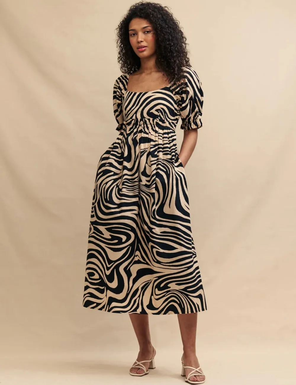 Jokainen tarvitsee hulmuavan smock-mekon. Ginger on vaivattoman kevyt mustassa pyörrekuviossa. Pöyhityt hihat ja röyhelöreunukset täydentävät rusetilla viimeistelty kaareva selkämys. Heitä olkikassi käsivartesi yli ja menoksi.