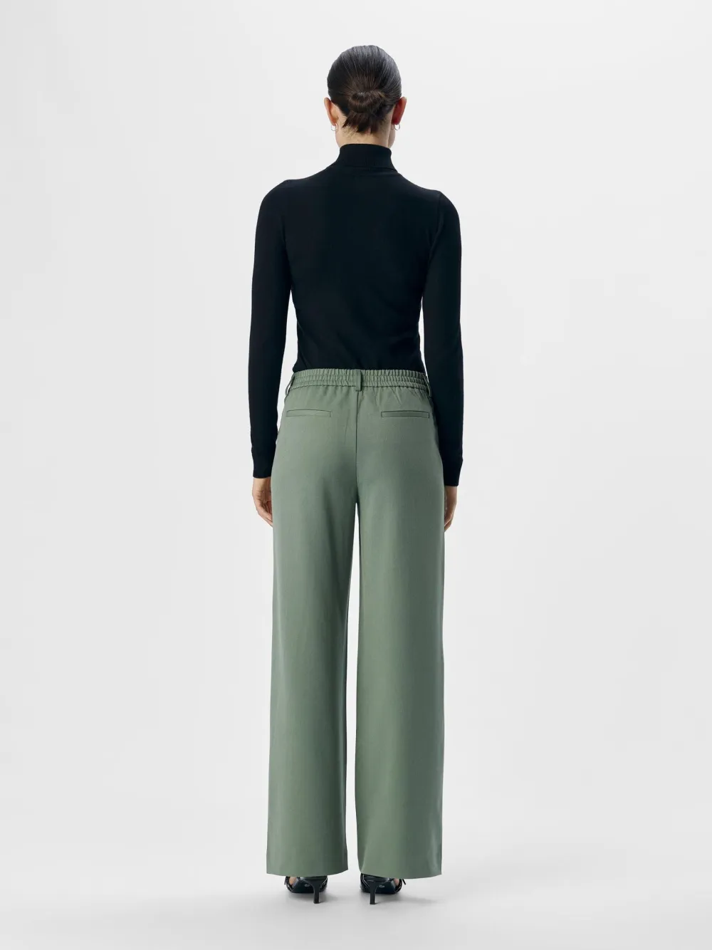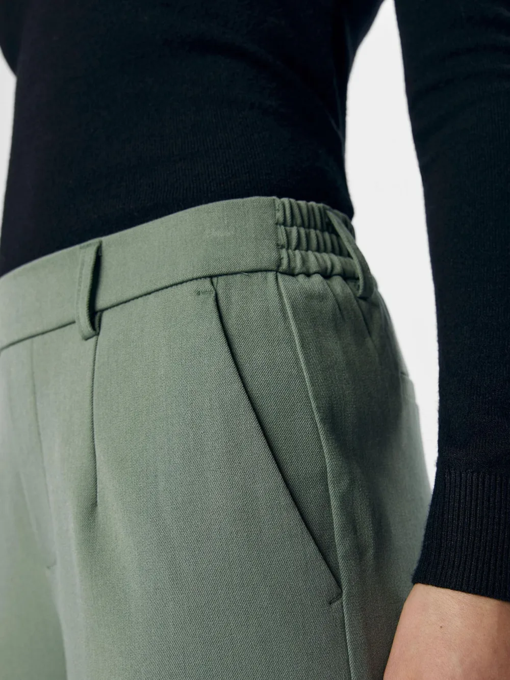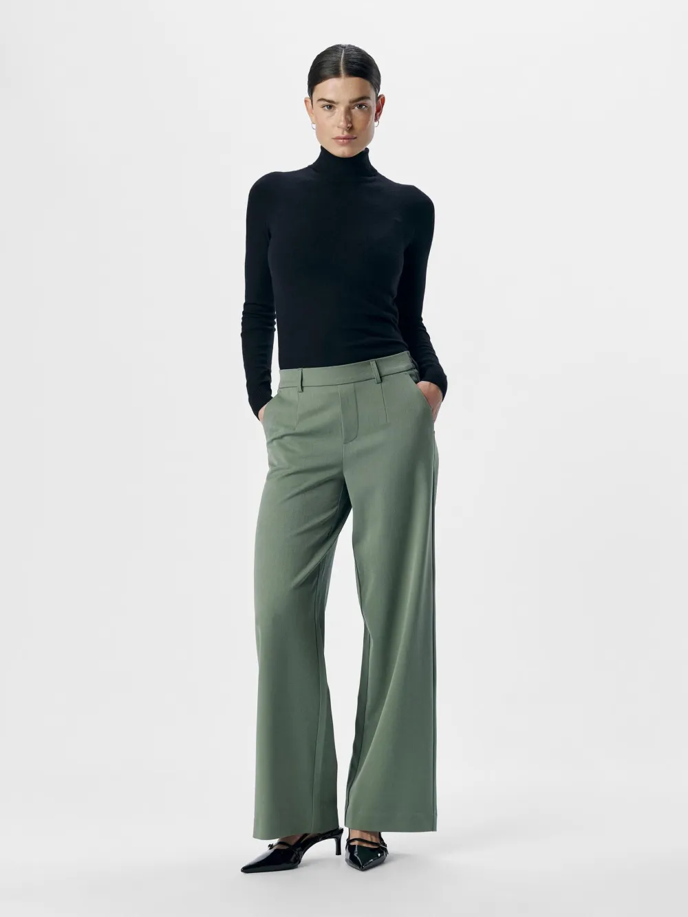 Naisten leveälahkeiset, nilkkapituiset housut, normaali vyötärön korkeus, vyötäröllä vyölenkit. Edessä laskokset..