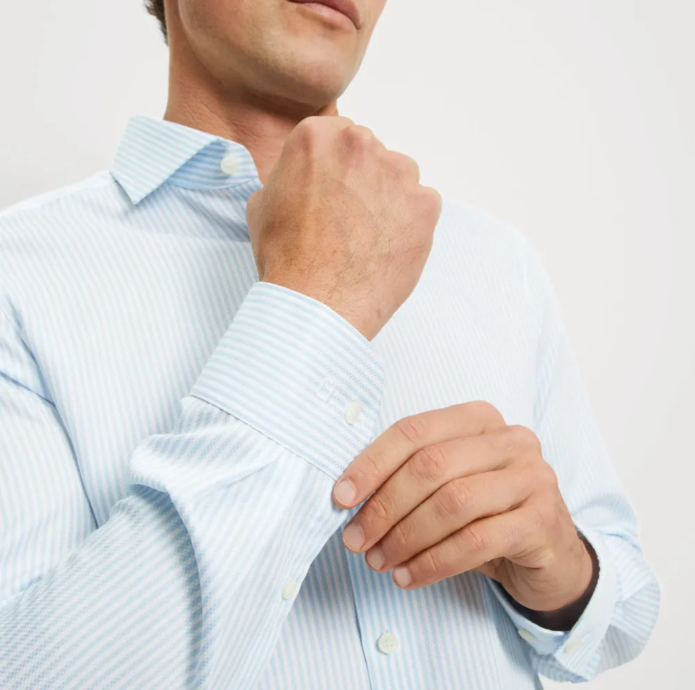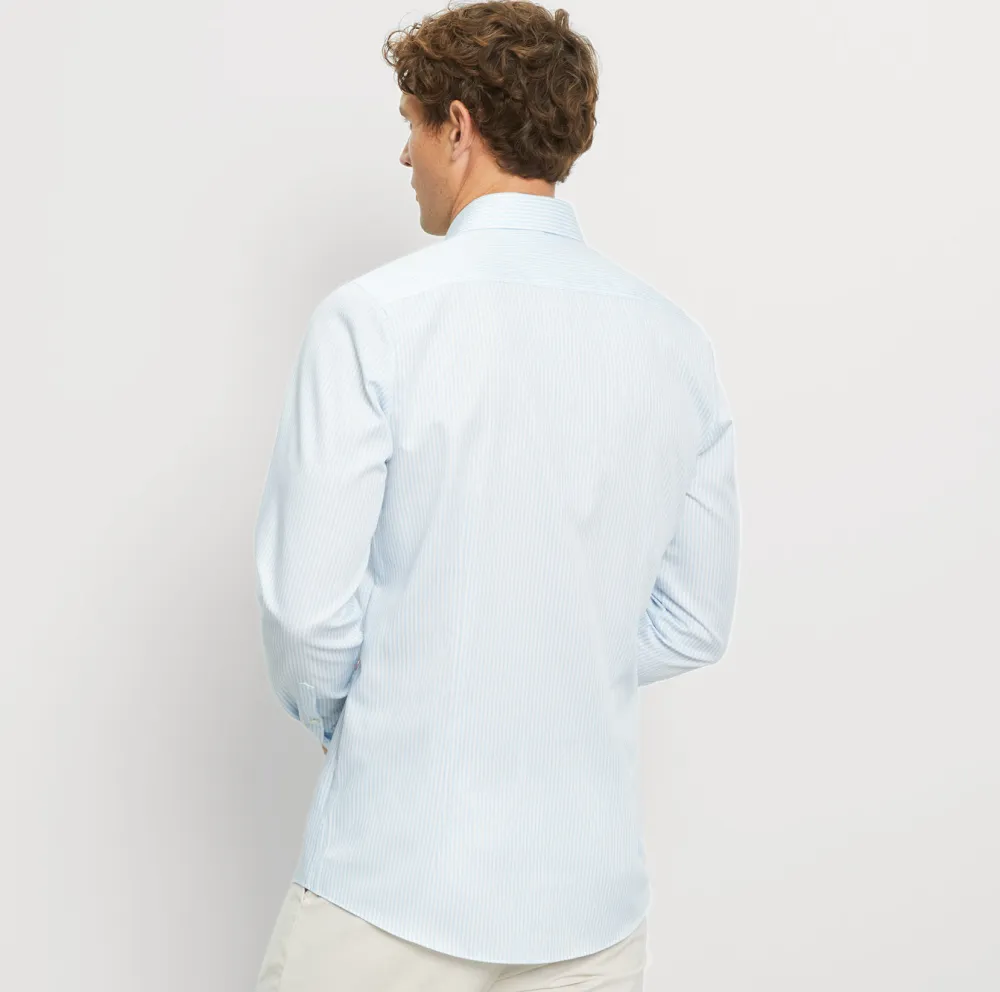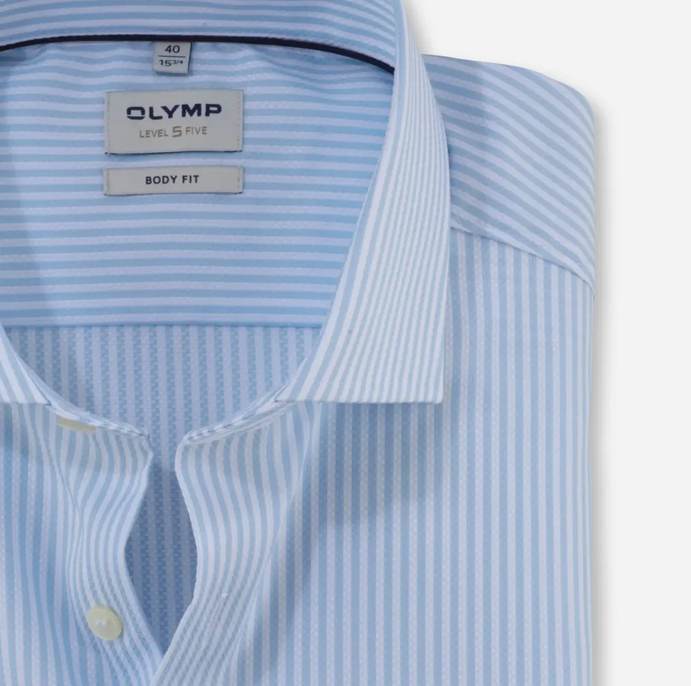 OLYMPLevel 5 Body Fit Stiped kauluspaita yhdistää klassisen tyylin ja modernin slim fit -istuvuuden. Kevyt ja hengittävä kangas on valmistettu 100 % puuvillasta, mikä takaa erinomaisen käyttömukavuuden ja helpon hoidon. Tyylikkäät raidat, hienostunut Royal Kent -kaulus ja hieman pyöristetty helma antavat paidalle elegantin mutta rentoon ilmeen. Muotoilu selässä tekee istuvuudesta siistin ja nykyaikaisen.