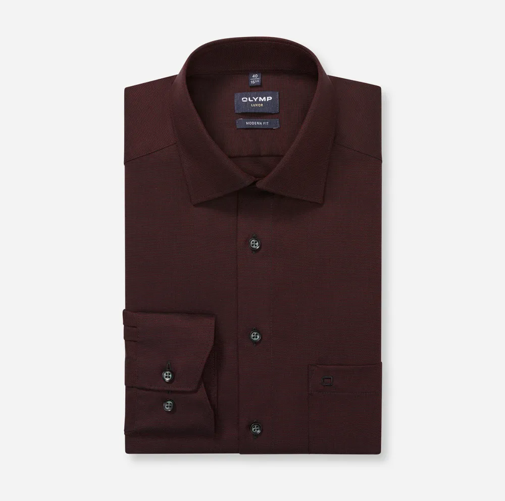 Tämä OLYMP Luxor Modern Fit -paita yhdistää elegantin ulkonäön ja käytännöllisyyden. Valmistettu 100 % puuvillasta, joka on non‑iron‑käsitelty, joten paita säilyy sileänä ilman silittämistä. Modern Fit ‑leikkaus tarjoaa huolitellun, hieman vartalonmyötäisen siluetin ja New Kent‑kaulus tuo klassista bisnestyyliä. Bordeaux-väri on tyylikäs ja monipuolinen, sopien erinomaisesti sekä pukujen että yksiväristen housujen kanssa. Paidassa on myös rintatasku brodeerauksella ja se on hengittävä ja ihoystävällinen – sopii koko päivän käyttöön.