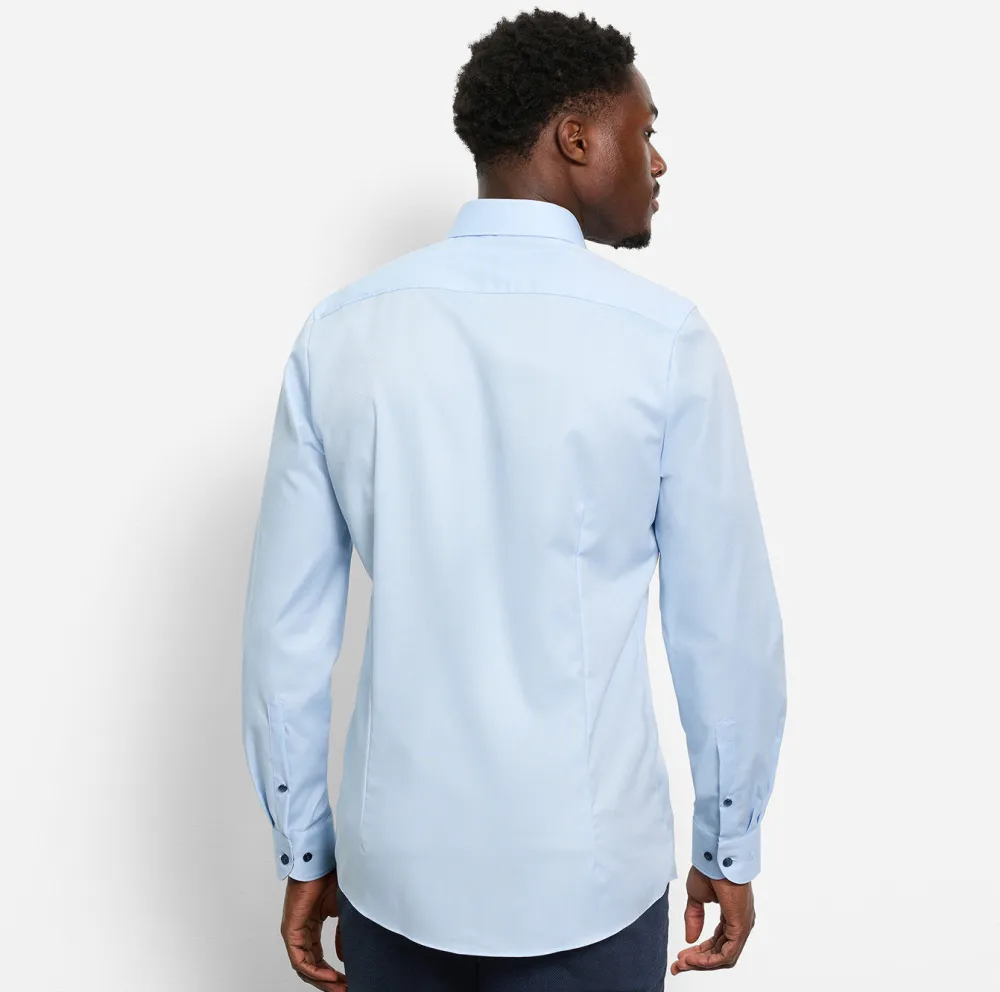 OLYMP-business-paita, jossa on muodikkaat kontrastivärit kauluksessa ja hihansuissa, sopii täydellisesti yhteen rentojen tyylien kanssa. Hienostunut ja minimaalisesti joustava puuvillakangas on ihoystävällistä, muotonsa säilyttävää ja hengittävää. Paidassa on New York Kent -kaulus ja se on erityisen helppo silittää.