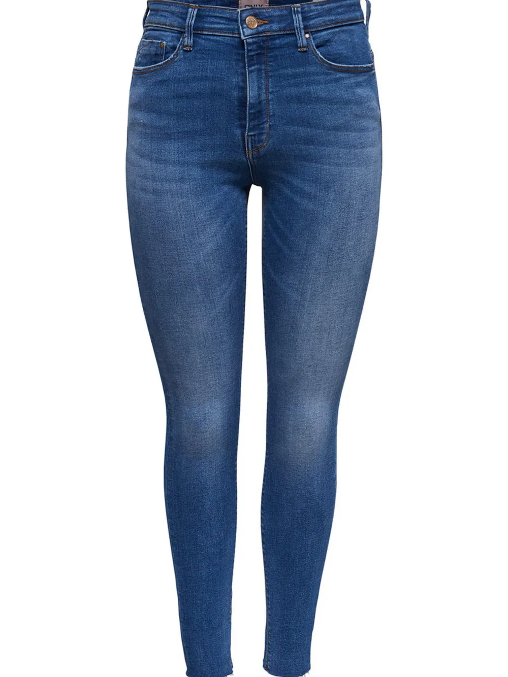 Onlyn kapealahkeiset farkut korkealla vyötäröllä. Klassinen 5-taskuinen malli, jossa nappi sekä vetoketju edessä. .Viimeistelemättömät lahkeensuut. Ihanan joustava materiaali