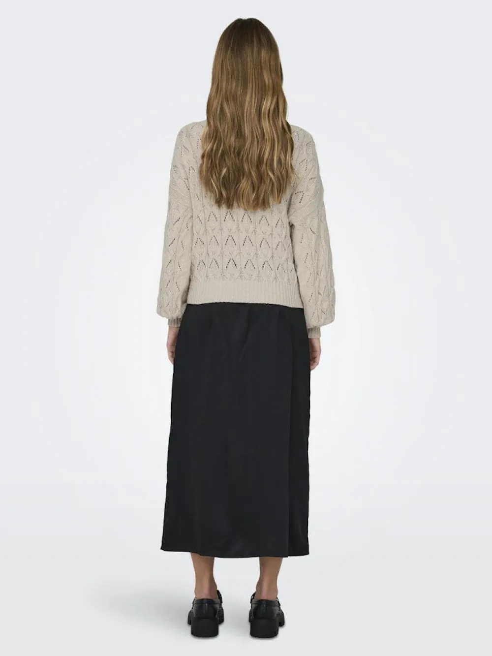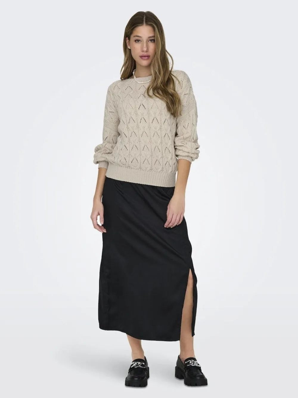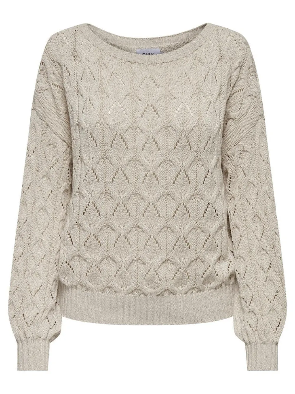 Onlyn puuvillainen neulepaita, jossa on kaunis kuvioitu pinta. Avara pääntie ja joustavat ribbneulotut resorit hihansuissa ja helmassa.