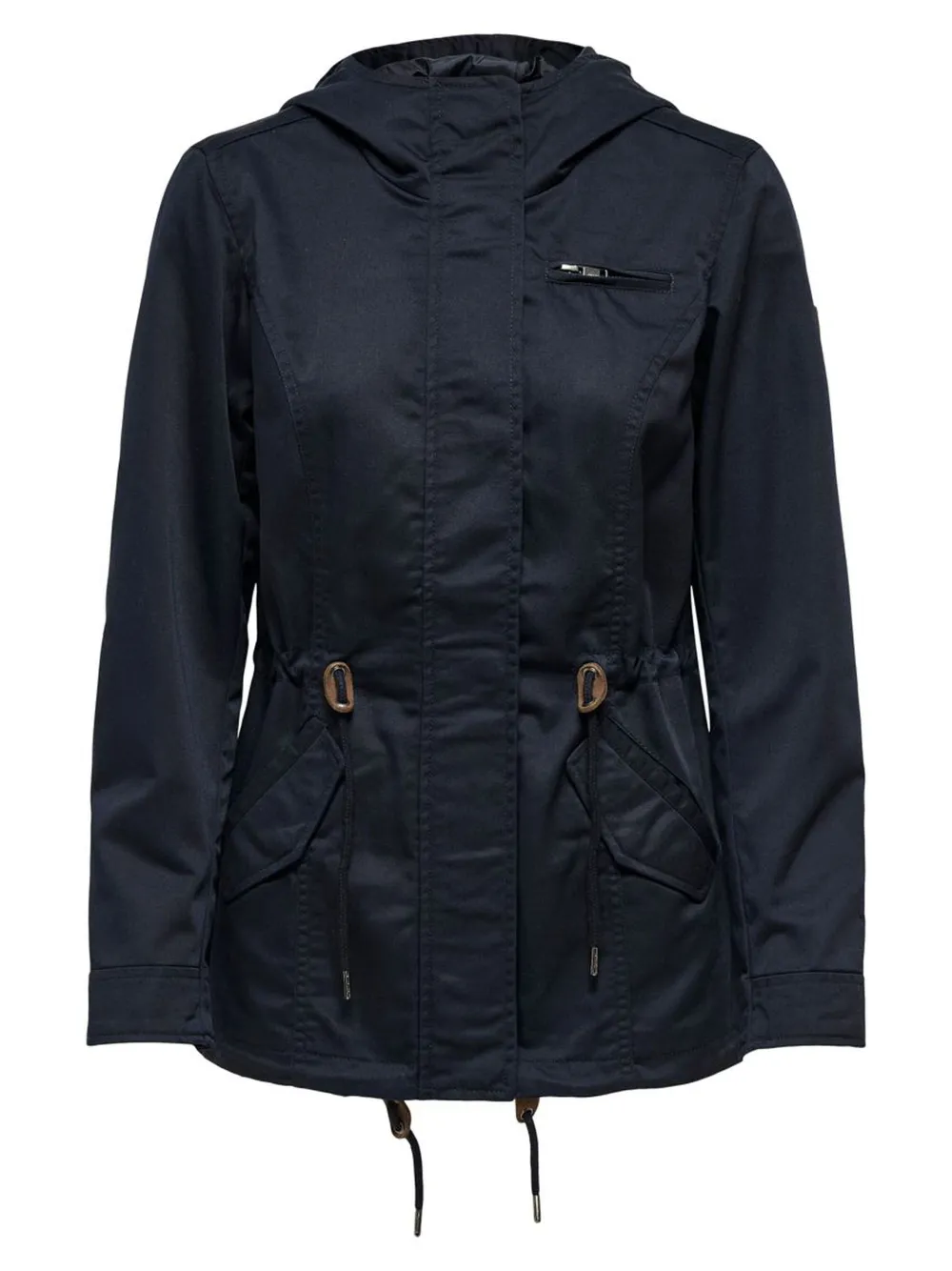 Onlyn kevyt parkatakki toimii välikausitakkina niin keväällä kuin syksyllä. Lyhytmallinen kevättakki, jossa on huppu ja hieman korotettu kaulus. Vetoketjukiinnitys ja nappilista, joka sujaa tuulelta. Vetoketjullinen rintatasku ja lpälälliset etutaskut. Vyötäröllä kiristysnauha. Takaa helma pyöristetty.