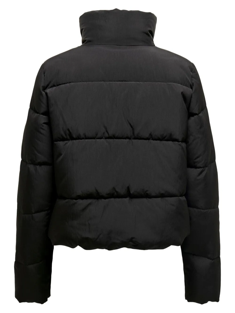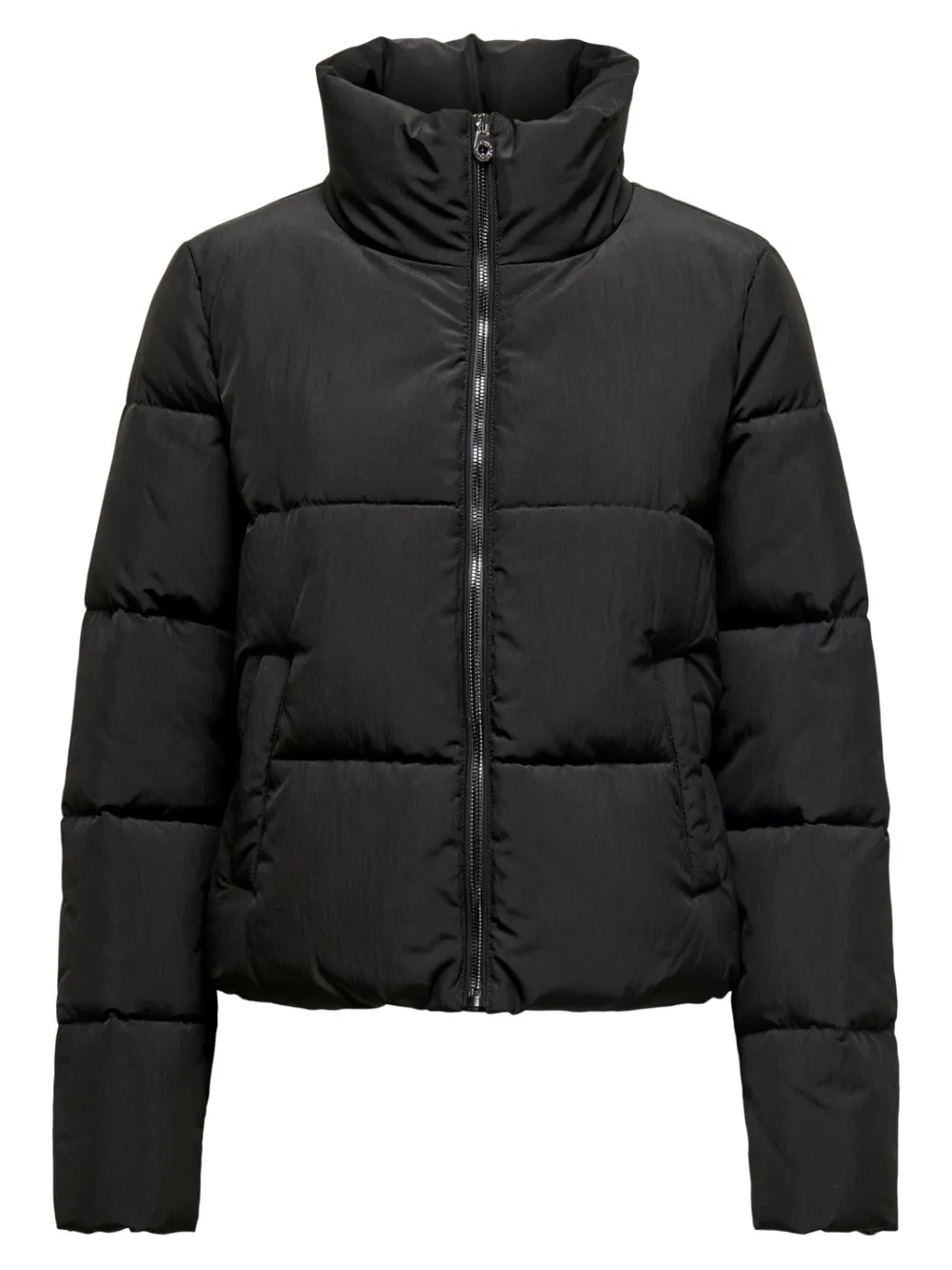 Onlyn lyhytmallinen puffer -toppatakki. Muhkea ja lämmin takki, jossa on korkea kaulus. Edessä vetoketjukiinnitys ja taskut.