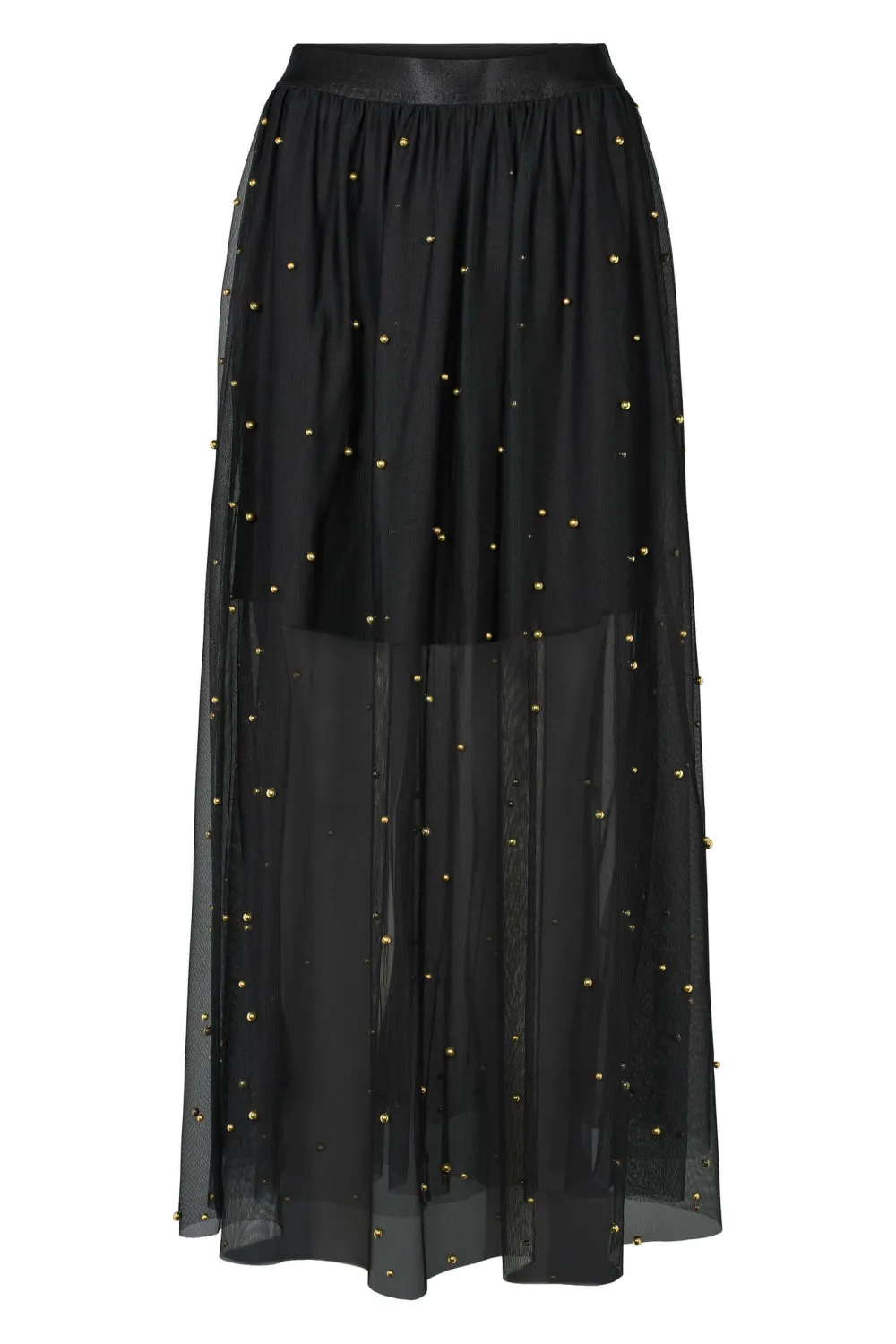Venus-hame antaa unenomaisen ilmeen kevyellä, läpinäkyvällä verkkokerroksella ja hienoilla kultahelmillä. Hame sopii täydellisesti juhlatilaisuuksiin ja antaa jokaiselle asulle naisellista ilmettä.