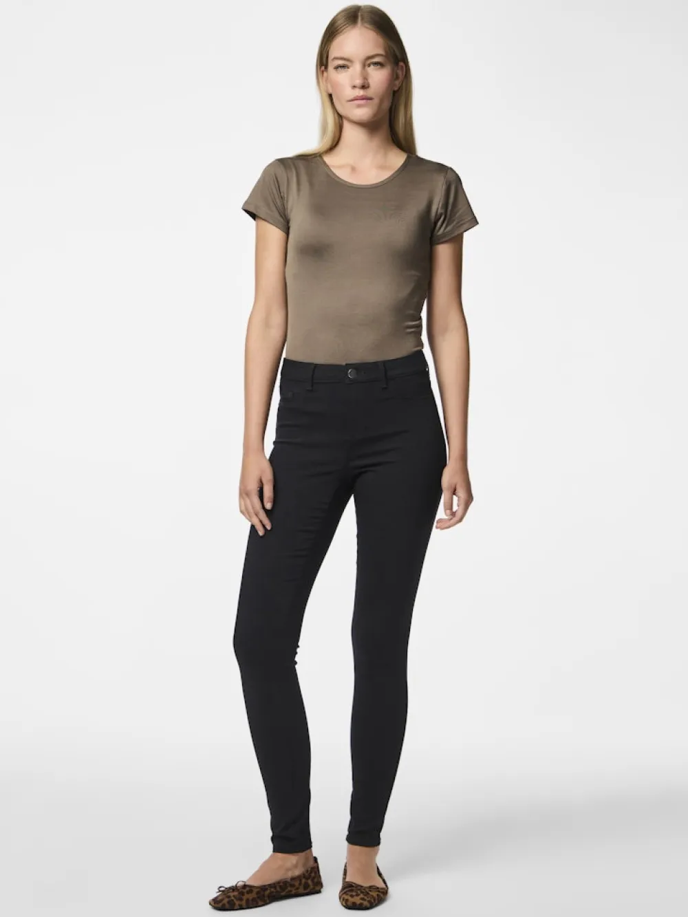 Piecesin naisten erittäin kapeat ja joustavat jegginsit. Kiinnitys edessä vetoketjulla ja napilla. Takana taskut.