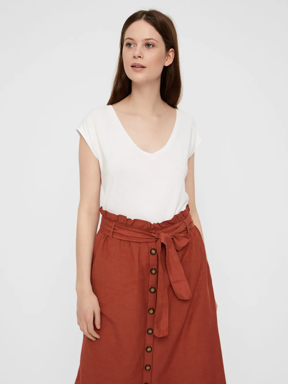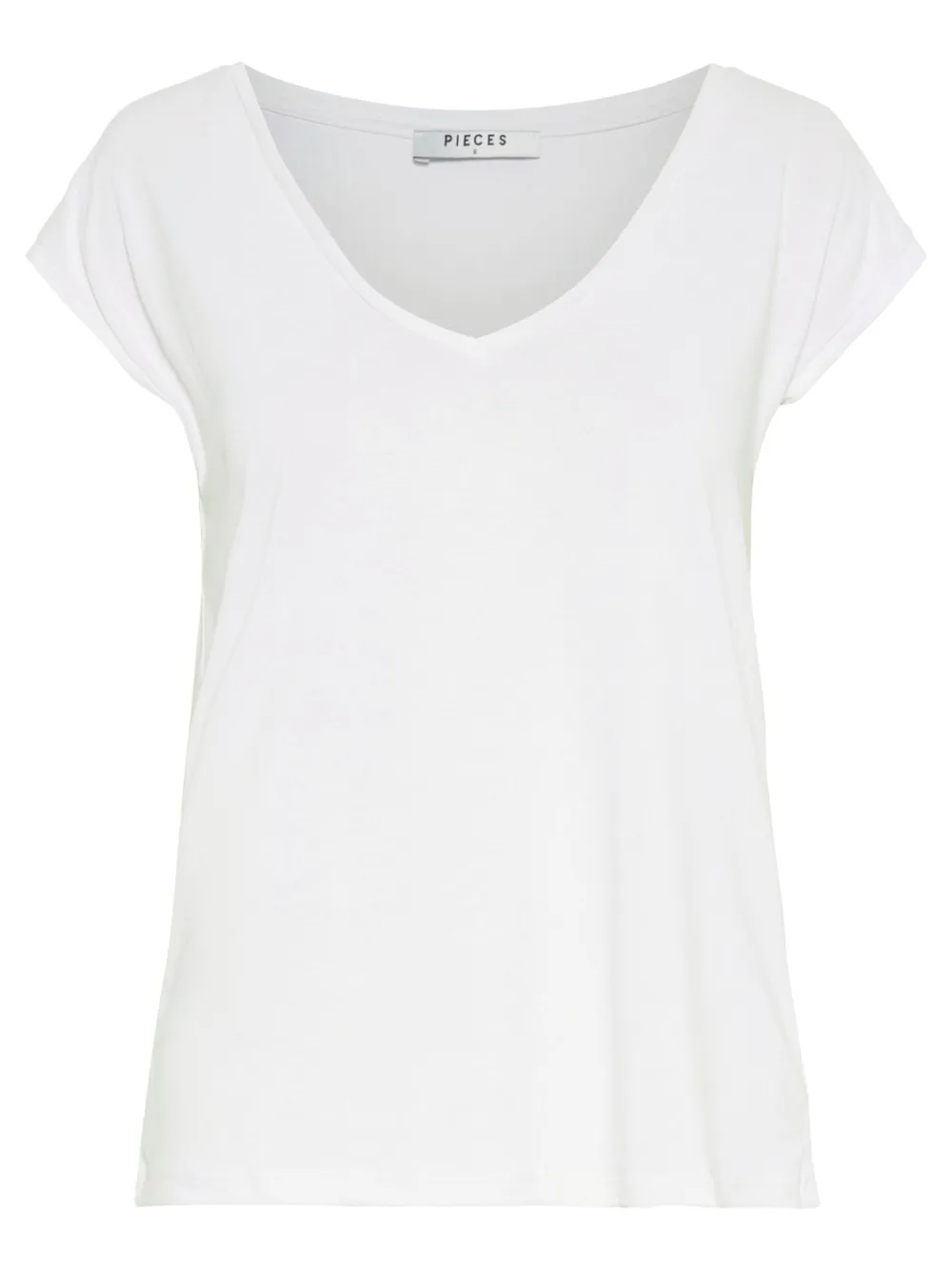 Pieces T-paidassa on joustava ja miellyttävä laatu. Pääntienä kaunis V. Suora istuvuus..