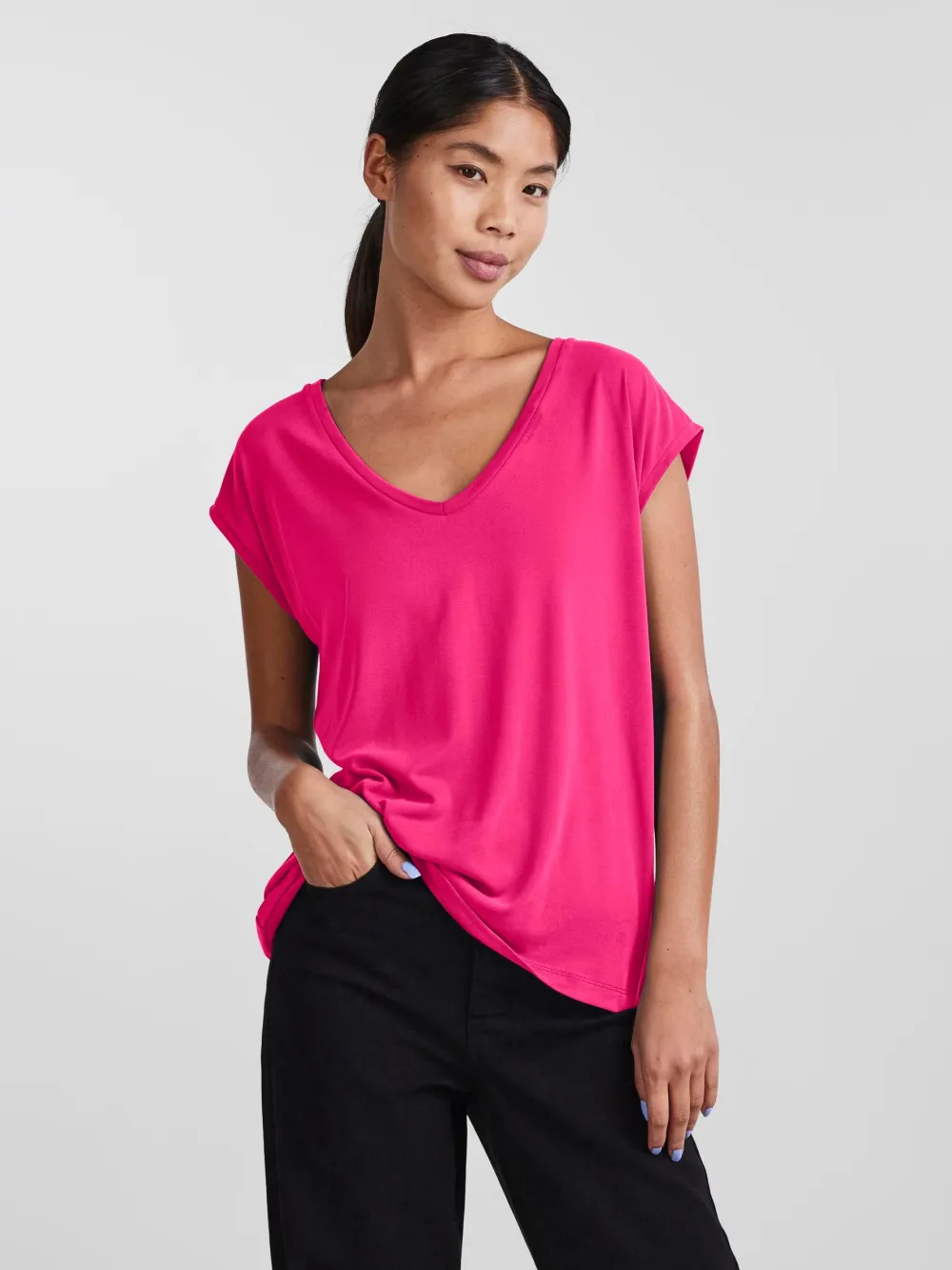 Pieces T-paidassa on joustava ja miellyttävä laatu. Pääntienä kaunis V. Suora istuvuus.