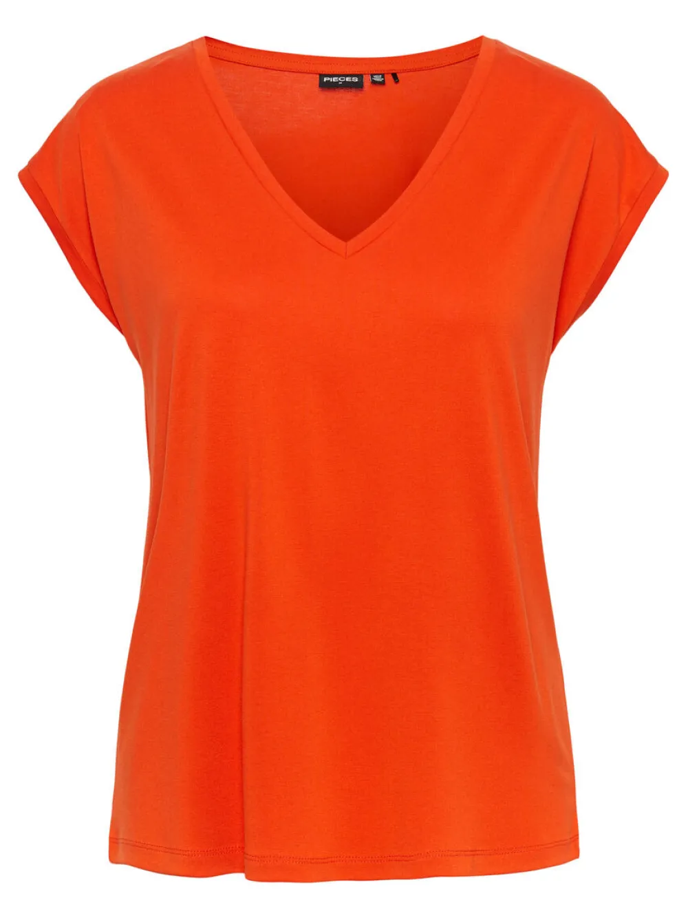 Pieces T-paidassa on joustava ja miellyttävä laatu. Pääntienä kaunis V. Suora istuvuus