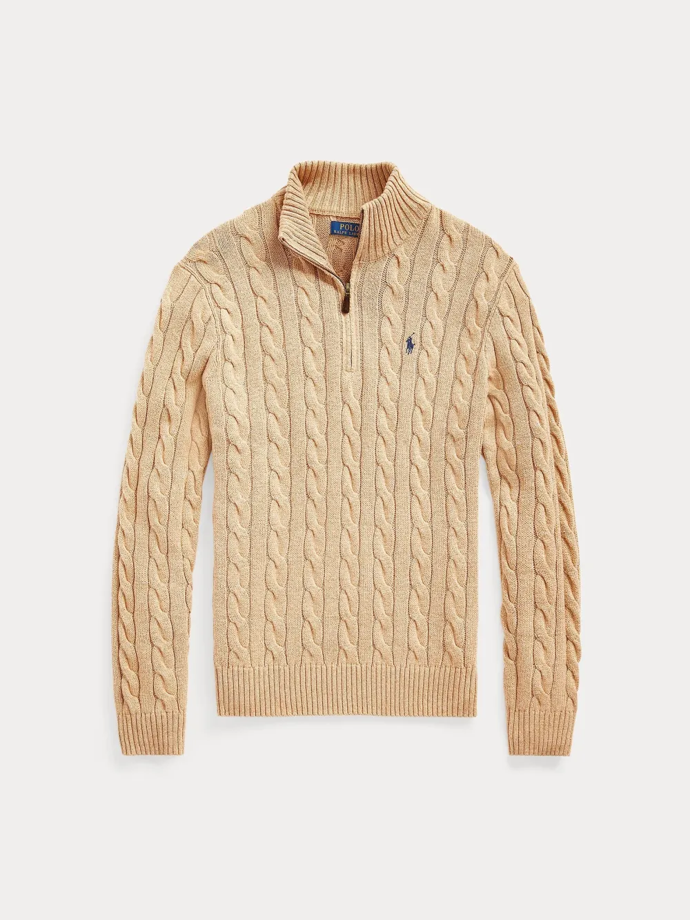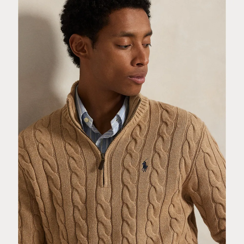 Polo Ralph Lauren Cotton Cable Driver Half‑Zip Pullover Beige on miesten palmikkoneule, valmistettu 100 % puuvillasta. Siinä on korkea mock‑kaulus ja puolivetoketju edessä, ribatut reunat sekä pitkät hihat regular fit -leikkauksella.