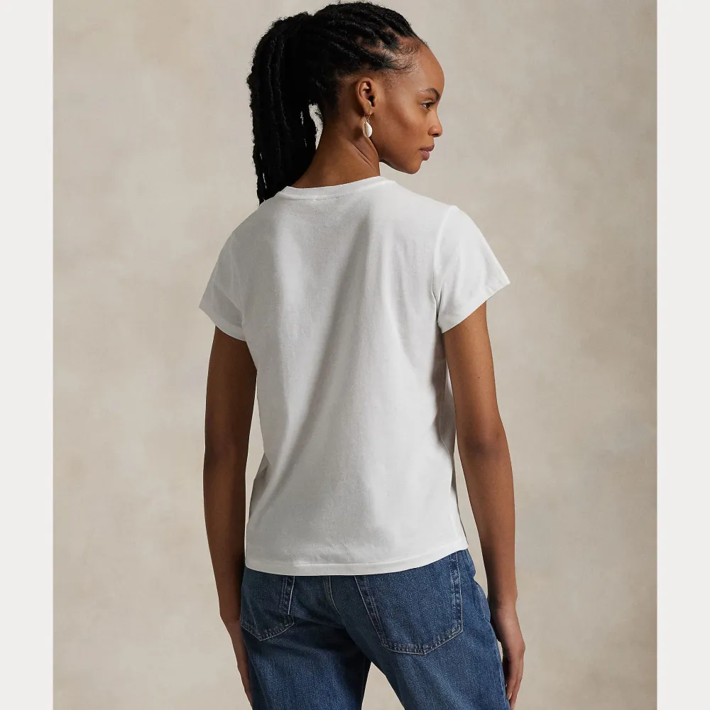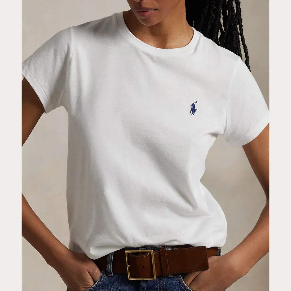 Suoraan leikattu puuvillajersey-paidaton pyöreä pääntie on pesty pehmeyden lisäämiseksi ja viimeistelty tavaramerkiksi muodostuneella poni-brodeerauksellamme.