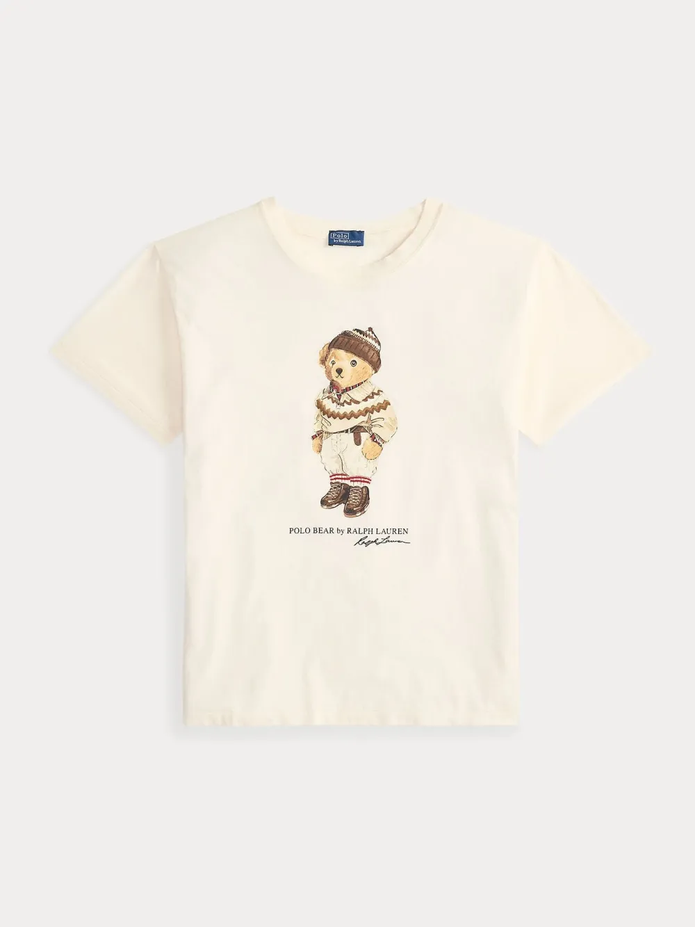 Tämä puuvillajerseystä valmistettu pyöreäkauluksinen t-paita on painettu kuminauhan avulla, ja siinä on tavaramerkkilogomme ja kylmän sään Ralph Lauren -lookiin puettu poolokarhu.