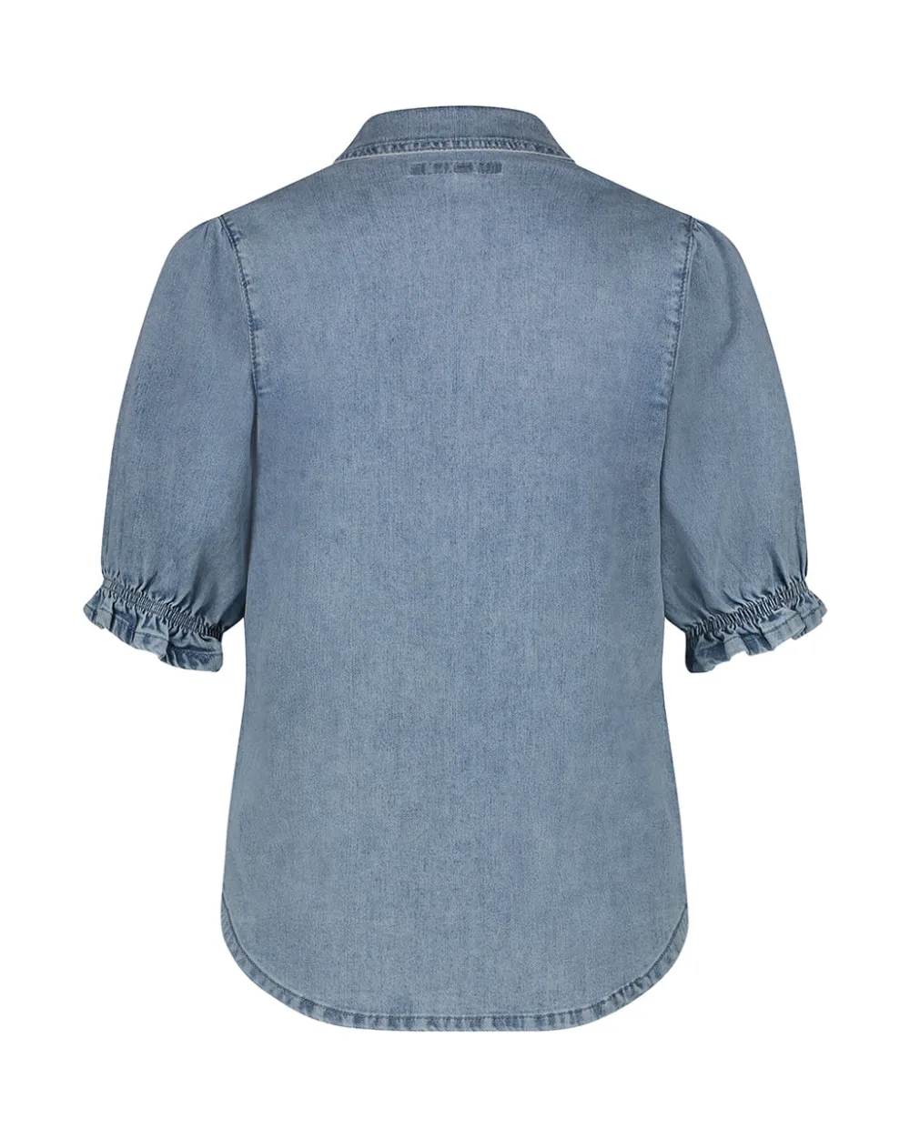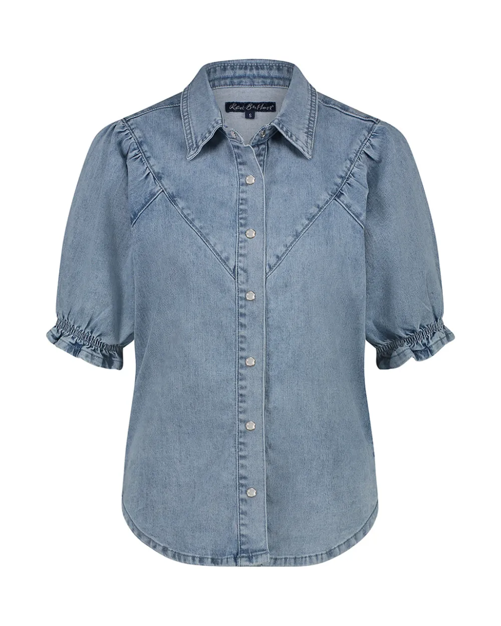 Red Buttonin farkkupusero prinsessamaisilla pallohihoilla ja diagonaali leikkauksilla. Puserossa on kauluspaitakaulus ja helmikoristeiset painonapit.