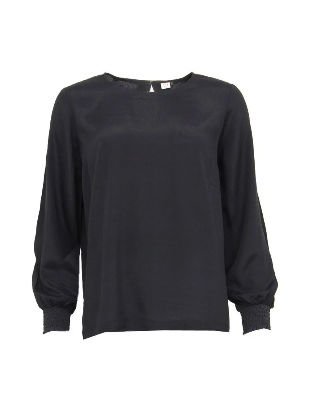 Naisten musta kangaspusero. O-pääntie ja takana yhden napin kiinnitys. Hihansuussa smokkirypytykset. Kaunis väljästi laskeutuva malli. Suora helma.