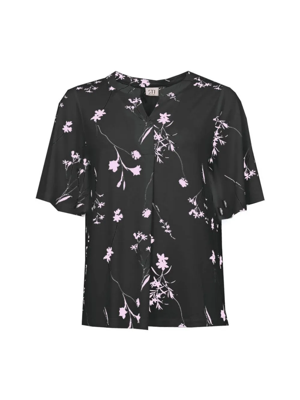 Naisten lyhythihainen trikoopusero , jossa pieni v-pääntie ja pieni laskos edessä. Puserossa on suora helma.