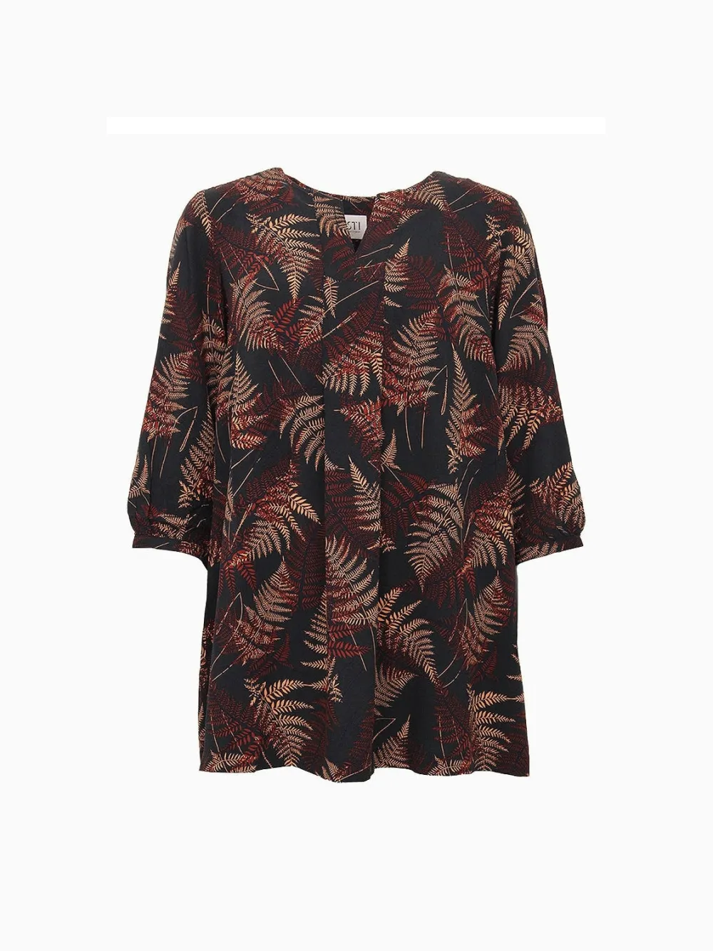 Tämä kevyesti laskeutuva kuosipaita hurmaa syksyisellä saniaiskuosillaan ja lämpimillä ruskan sävyillä. V-mallinen pääntie ja eteen kevyesti laskostettu leikkaus tuovat ilmettä ja liikkeen tuntua. Puolipitkät hihat viimeistelevät rennon ja tyylikkään kokonaisuuden, joka toimii niin arjessa kuin rennommissa juhlissa.