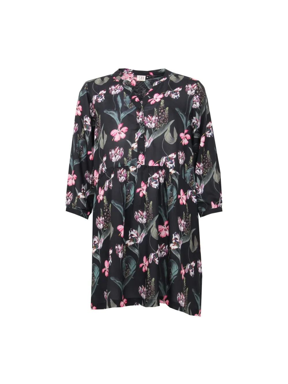 Tämä silkkisen tuntuinen viskoositunika ihastuttaa kepeydellään. Pitkät hihat, halkiopääntie ja nappilista vyötärölle asti tuovat asuun huoliteltua ryhtiä. Vyötärön pyöristetty poikkisauma korostaa pehmeästi siluettia ja luo naisellisen linjan. Kevyt ja kauniisti laskeutuva materiaali tekee tunikasta erinomaisen valinnan sekä arjen menoon, että viimeisteltyyn vapaa-ajan asuun.