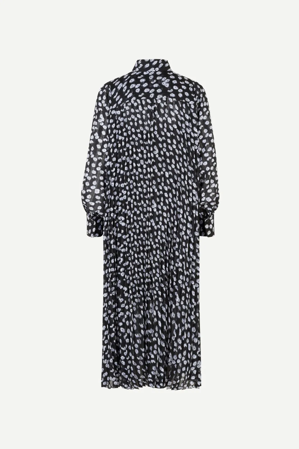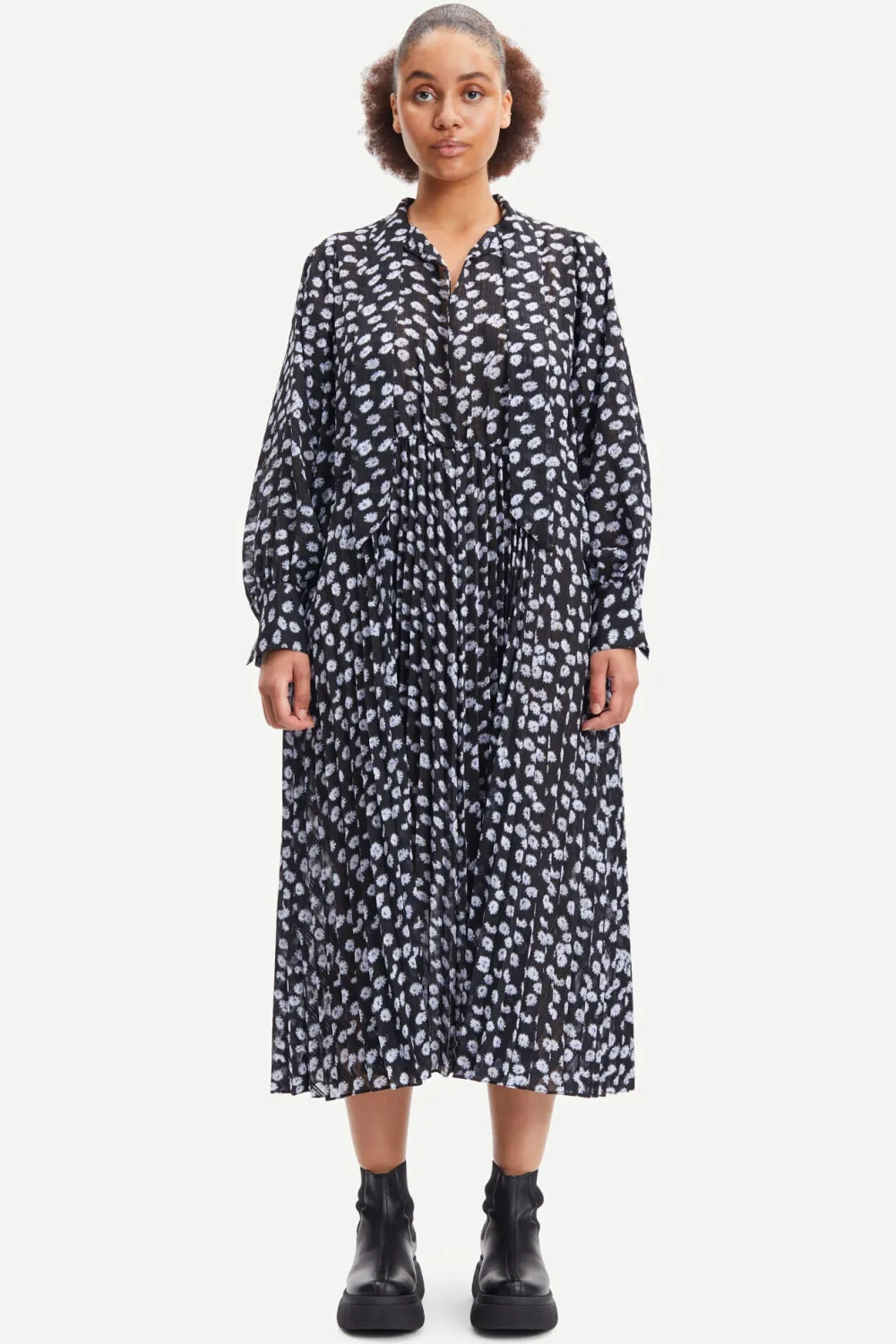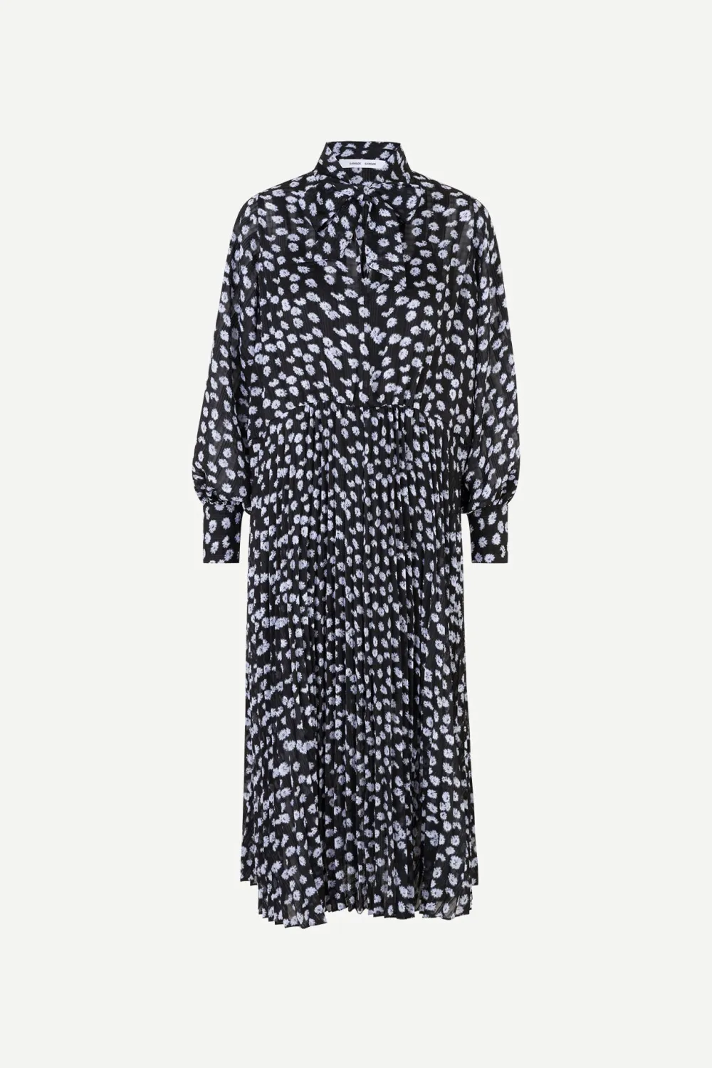 Naisten midimittainen mekko. Mekossa solmittava kaulus ja halkio. Mekossa pitkät hihat, joissa nappikiinnitys hihansuissa.