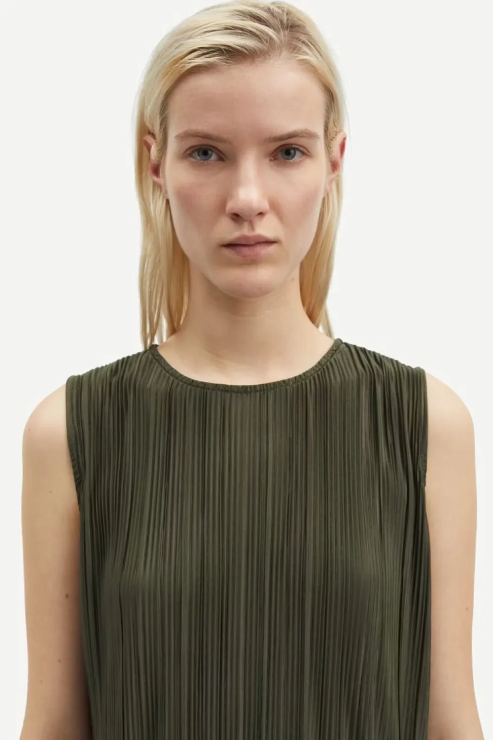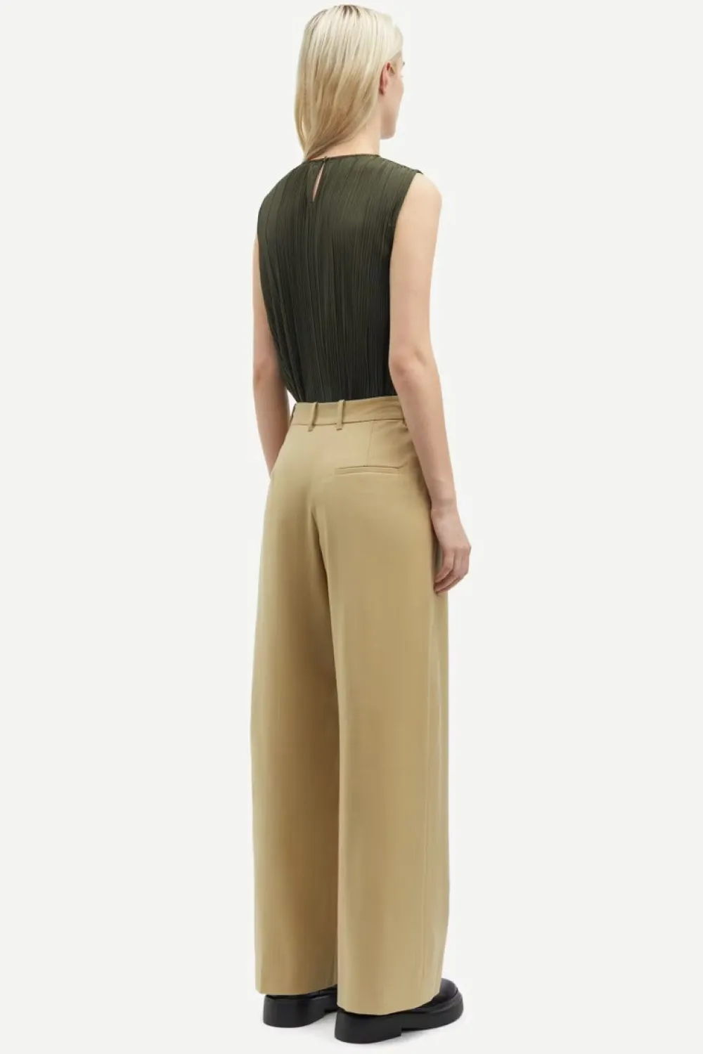 Pliseerattu toppi regular fit istuvuudella. Takana silmukka- ja nappikiinnitys.