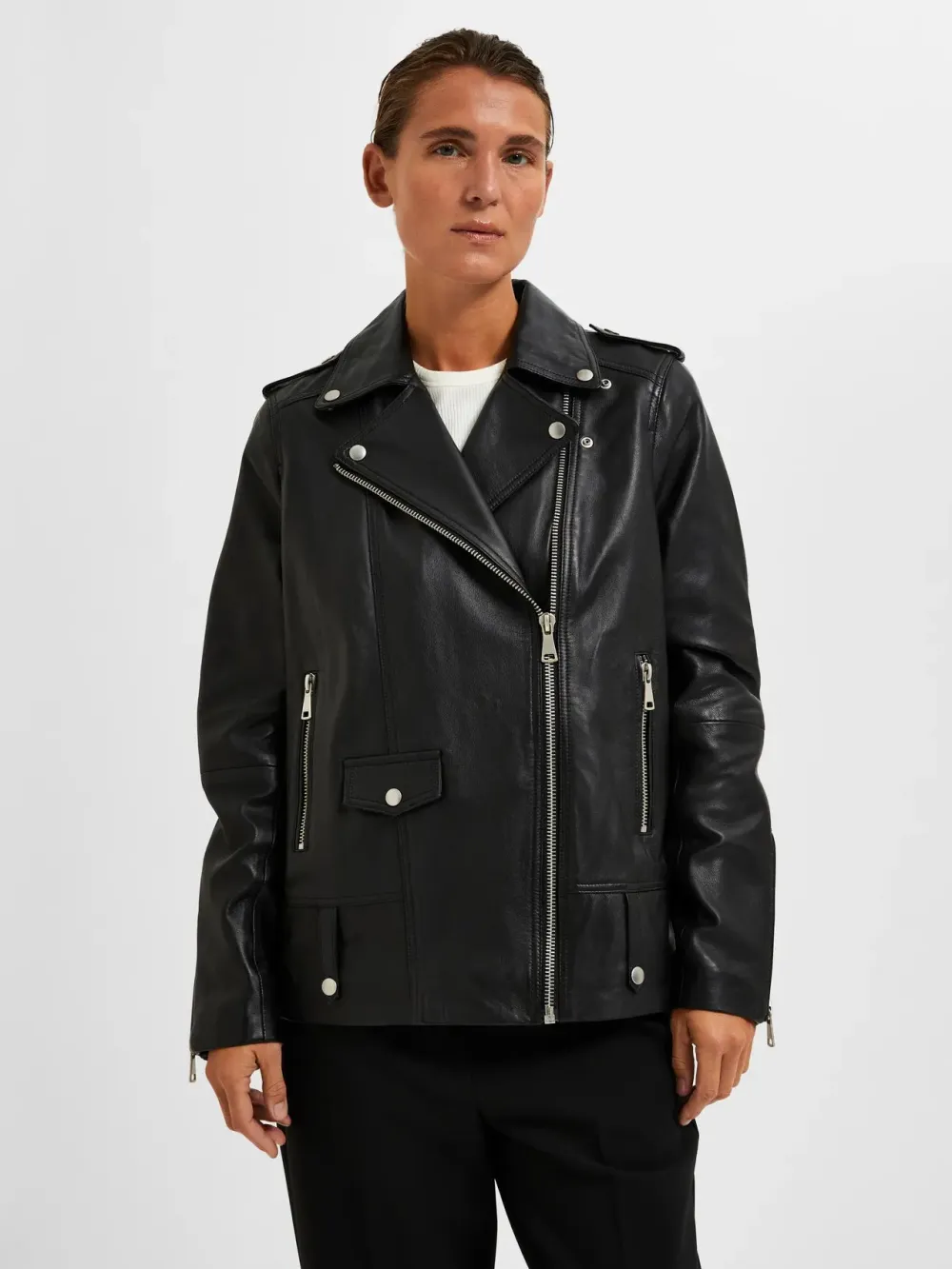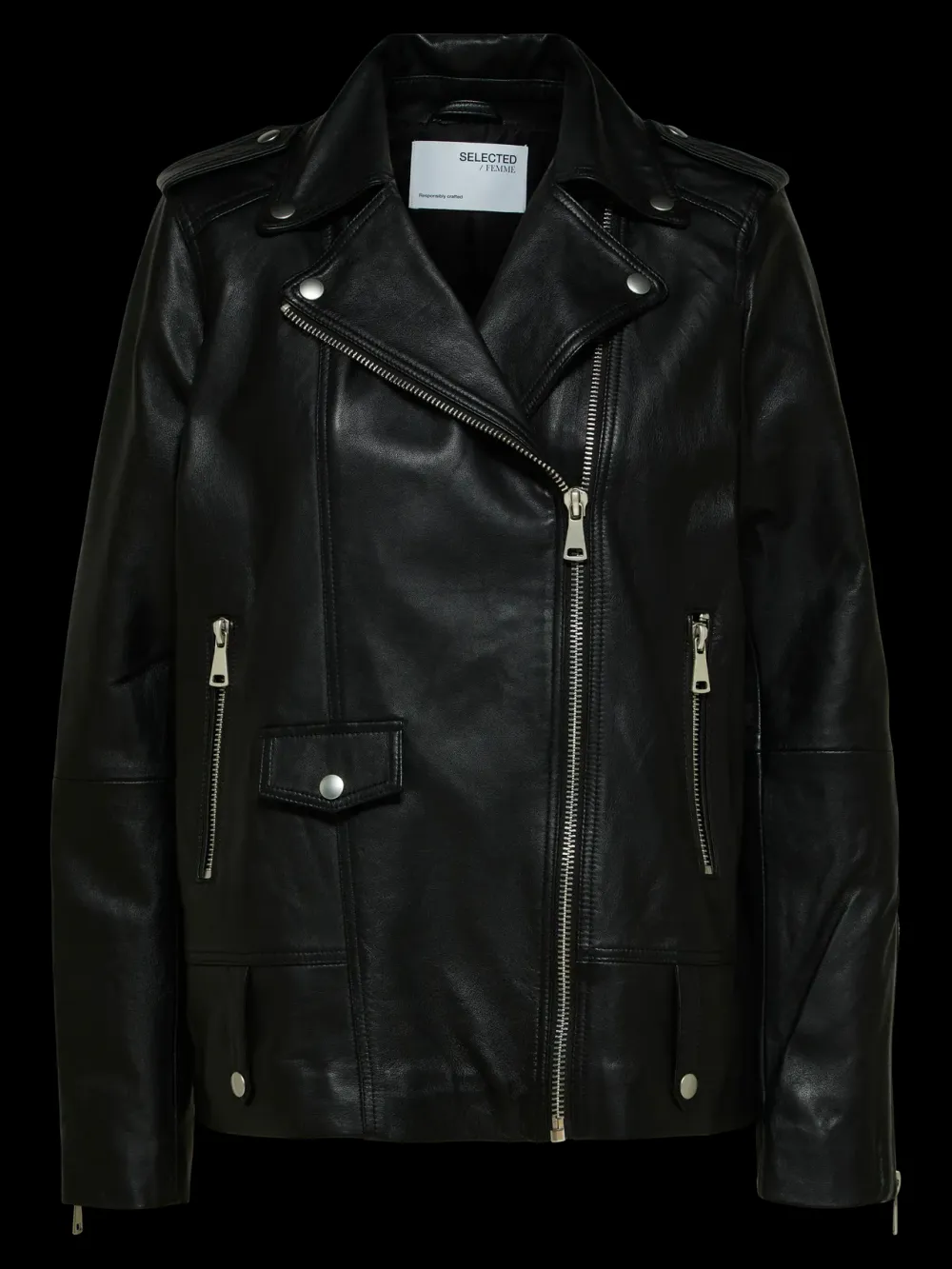 Selected Femme pehmeä suorahelmainen lampaannahkatakki. Tässä takissa on paljon kivoja yksityiskohtia. Tampit olkapäillä, vetoketjutaskut sekä vetoketjut hihansuissa. Kauluksen voi vaihtoehtoisesti pitää neppareilla auki tai laittaa vetoketjulla kokonaan kiinni. Ajaton ja tyylikäs malli.