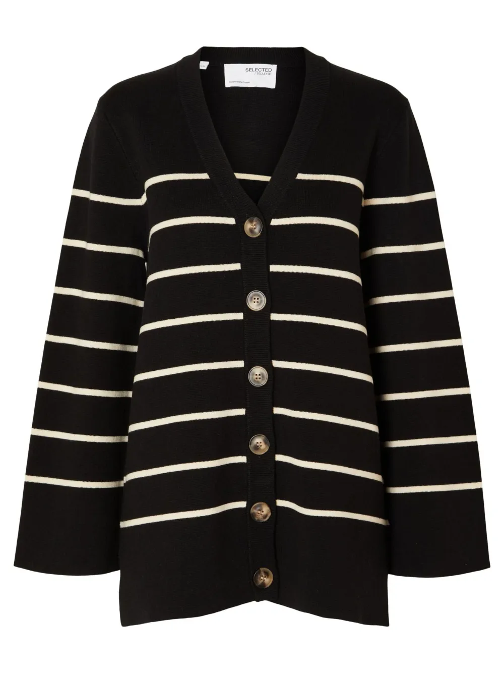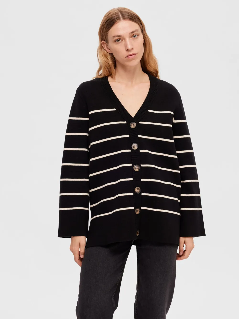 Luomupuuvillasta valmistetussa neuletakissa on näyttävän kokoiset napit ja lasketut olkapäät.