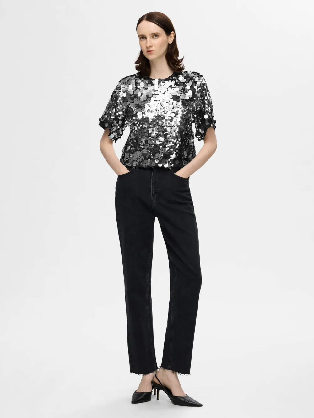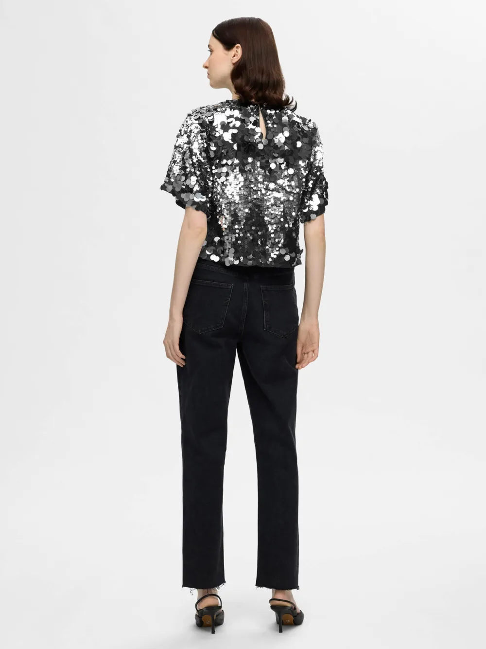 Paljettipusero, jossa on pyöreä pääntie ja 3/4 pitkät, leveät hihat. Lyhyt pituus.