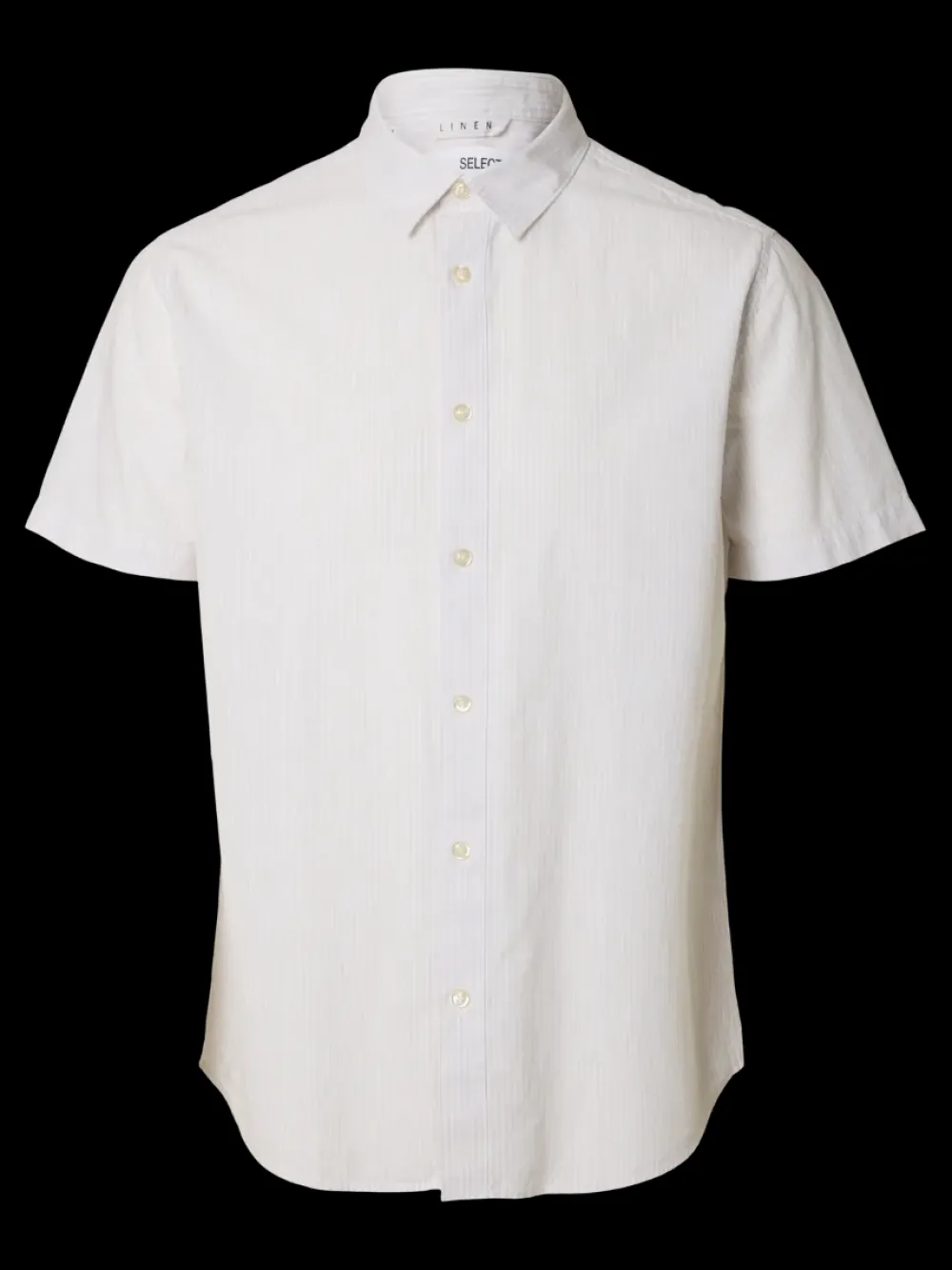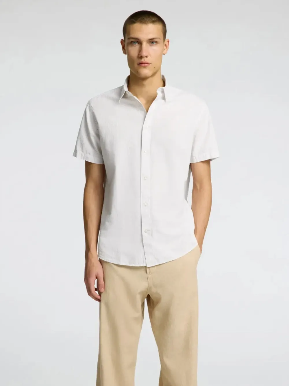 Selected miesten kauluspaita, normaali mitoitus. Materiaali pehmeää ja vilpoista pellavan ja puuvillan sekoitetta.