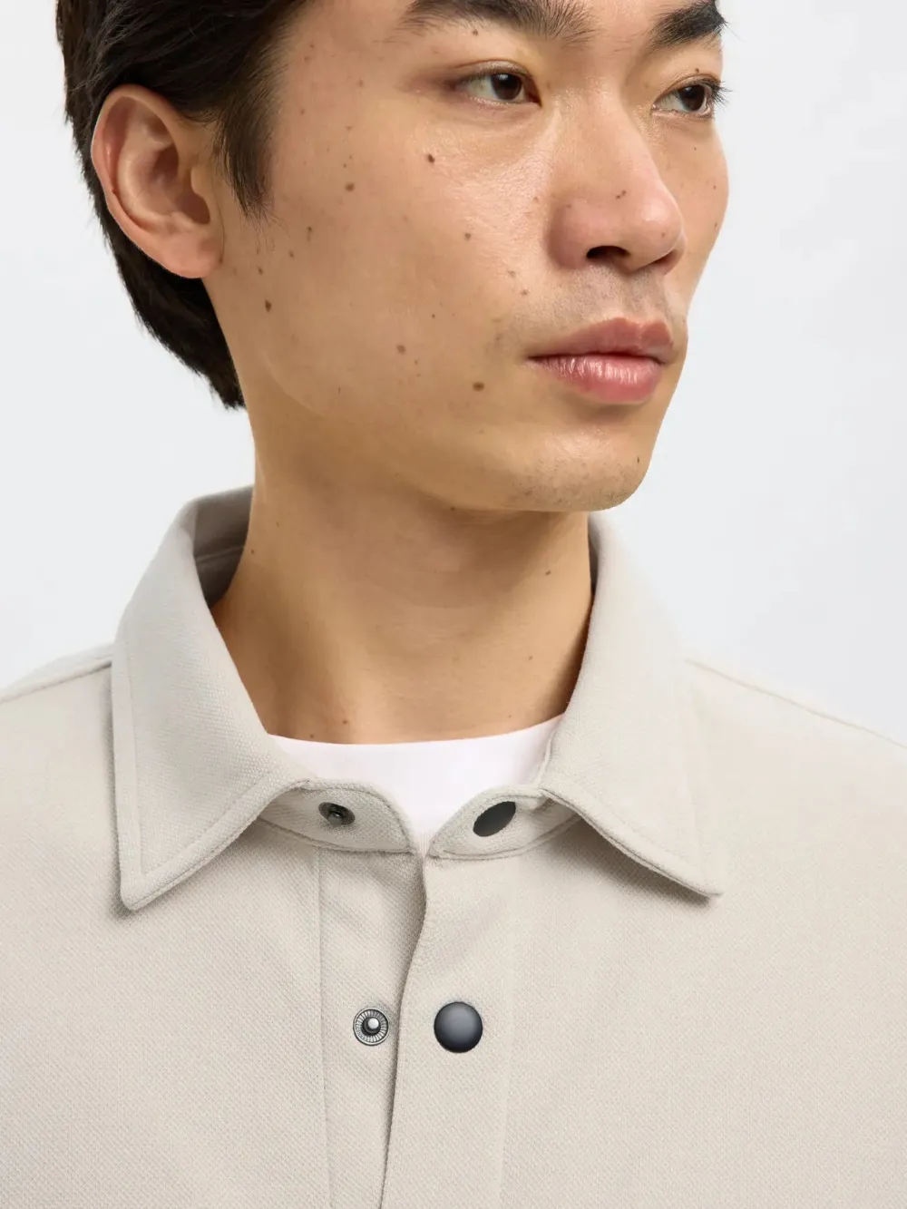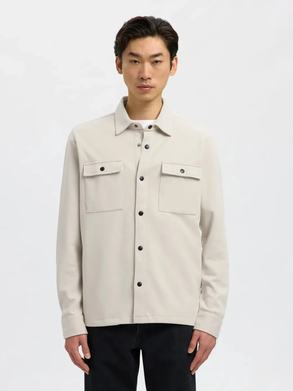 Selectedin rento ja trendikäs paitatakki. Kaulukset ja nepparikiinnitys edessä. Läpälliset rintataskut nepparilla. Materiaali joustavaa ja pehmeää luomupuuvillasekoitetta.