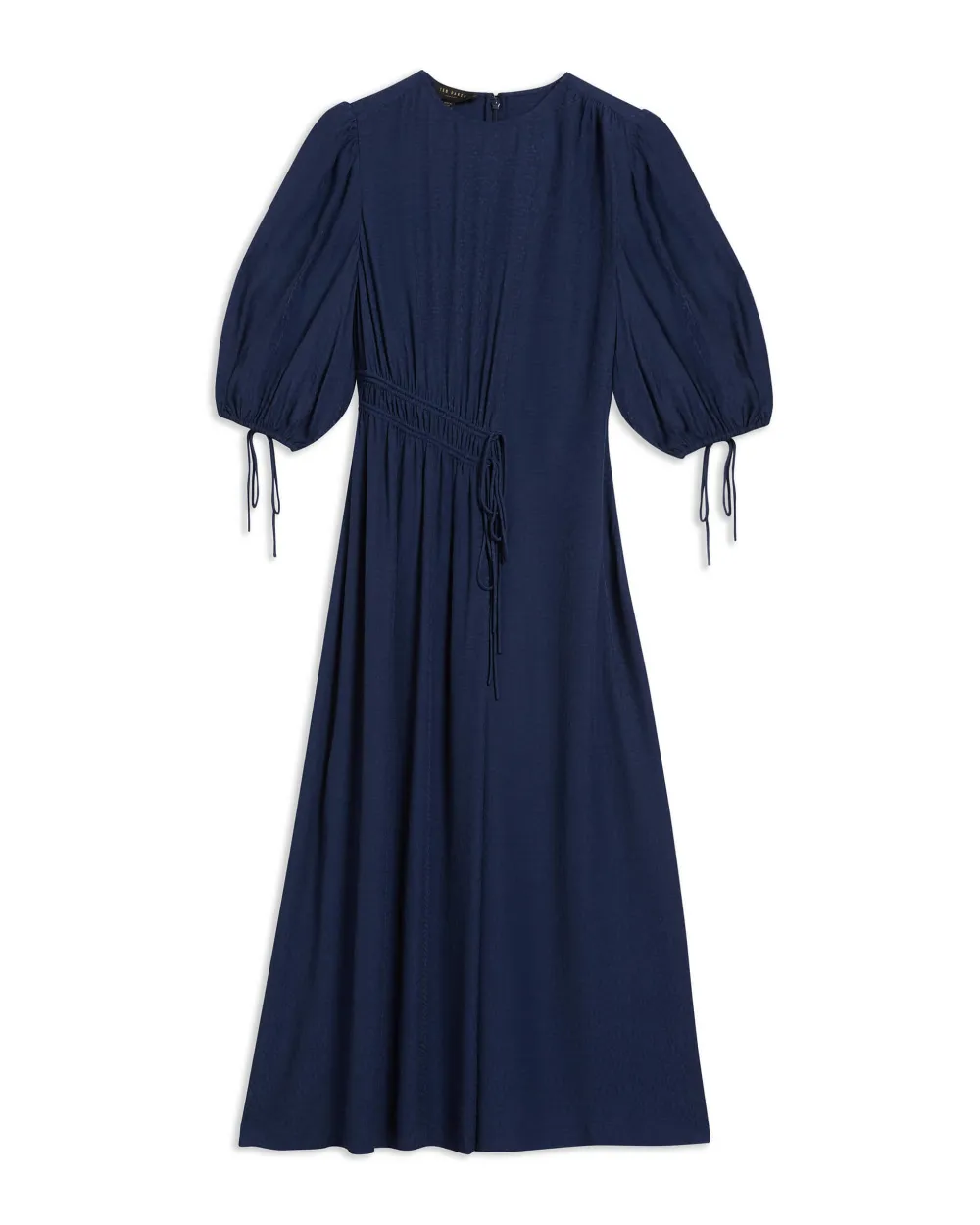 Ted Bakerin ihastuttavassa puffihihaisessa midimekossa on yksityiskohtana vyötäröllä toispuoleinen rypytys nauhoilla. Mekossa on takana vetoketju ja istuvuus on väljä.