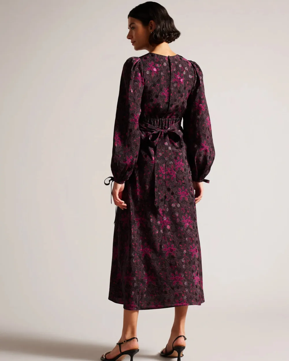 Ted Baker naisten kuosillinen midimekko. – Kukkakuosi – Pitkät tilavat hihat – A-linjainen – Pyöreä kaula – Vetoketju ja nappikiinnitys – Rusetillinen selkä