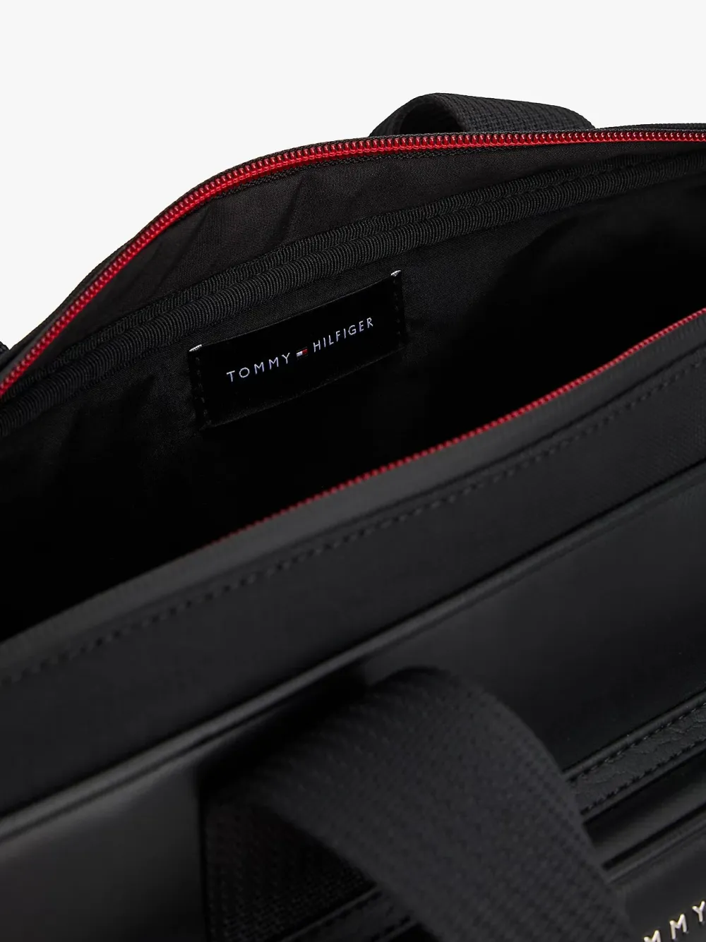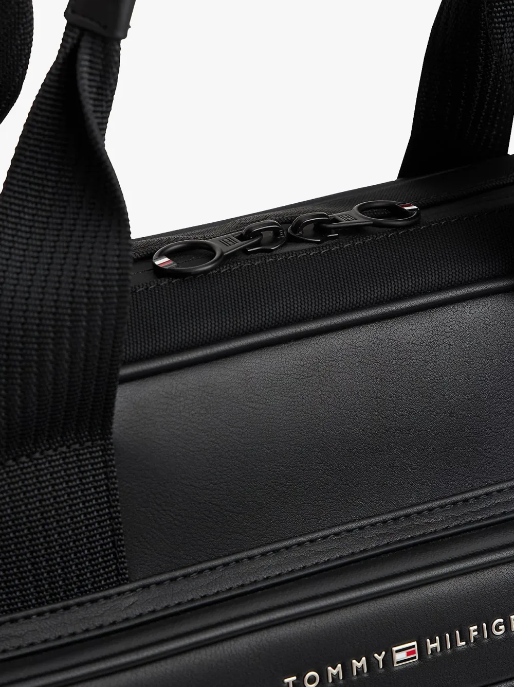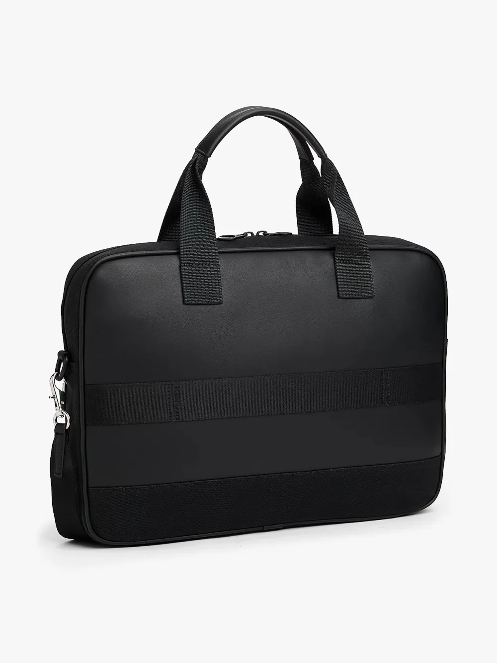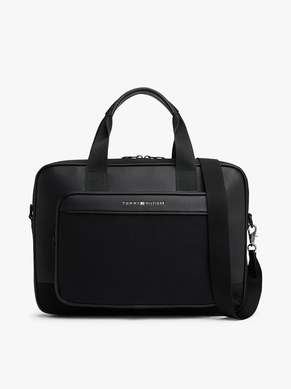 Tommy Hilfiger Metal Logo Laptop Bag on moderni ja minimalistinen laukku, suunniteltu pitämään kannettava tietokone ja tarpeelliset tarvikkeet tyylikkäästi järjestyksessä. Laukku on valmistettu 100 % polyuretaanista, jonka sileä ja strukturoidut paneelit antavat elegantin ja siistin ulkomuodon. Siinä on pehmustettu sisätasku läppärille, vetoketjusuljettu pääosa, ulkotasku pienille tavaroille sekä kaksi yläkahvaa ja irrotettava, säädettävä olkahihna monipuoliseen käyttöön. Laukun kompakti koko ja haban rivakat mittasuhteet tekevät siitä kätevän kumppanin arkeen, työpäivään tai matkoille – yhdistä se bleiserin, takin tai rentoon asuun tilanteen mukaan. Useampi kantotapa ja huoliteltu muotoilu tekevät tästä laukusta monikäyttöisen valinnan tyylitietoiselle.