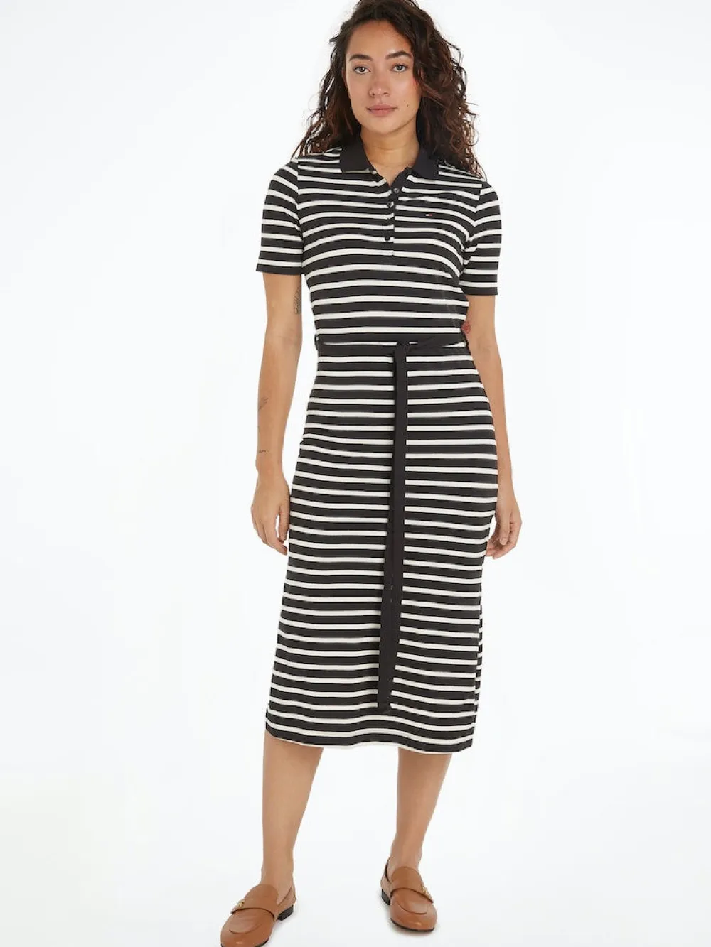 Naisellinen ja rento mekko polokauluksella ja raitakuvioinnilla. Joustavaa luomupuuvilla. Vyötäröllä solmittava nauha. Tommy Hilfiger -brändäys. Midi mitoitus ja regular fit istuvuus.