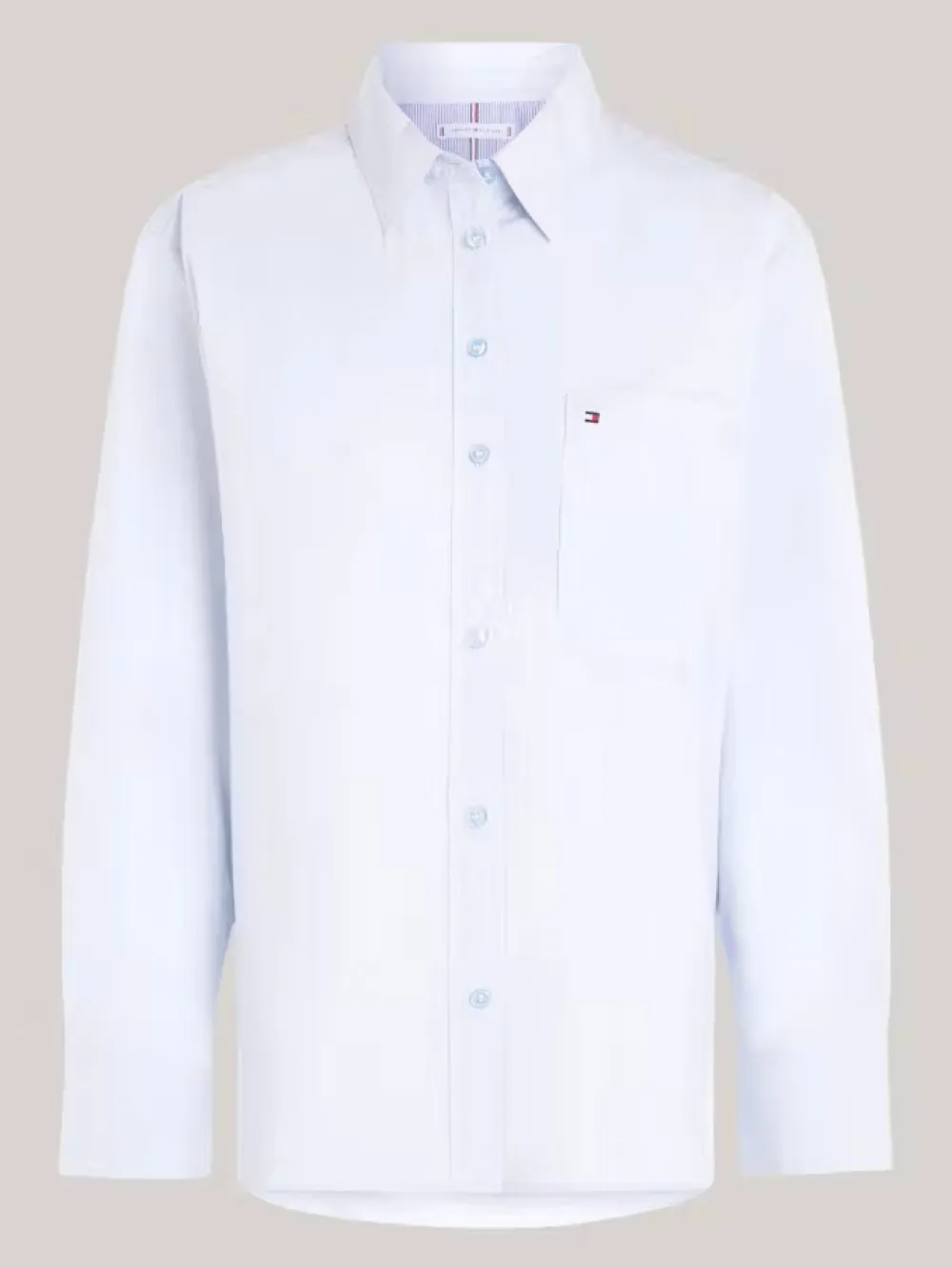 Tommy Hilfigerin naisten paitapusero, jossa rento istuvuus, pyöristetty helma, yksi rintatasku sekä kääntökaulukset. Kauluspaidan materiaali on puuvillapopliinia