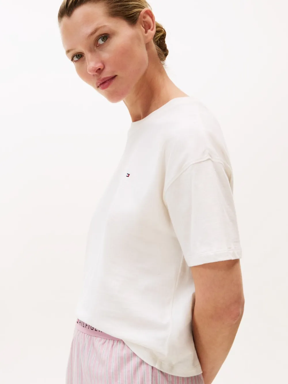 Tämä Tommy Hilfiger Pyjama Set on suunniteltu täydellisen rentouttaviin kotihetkiin. Setti koostuu pehmeästä puuvillajerseystä valmistetusta T-paidasta, jossa on pyöreä kaula-aukko, rento leikkaus ja ikoninen Tommy Hilfiger -brändäys rinnassa. Shortseissa on raidallinen kuosi, joustava vyötärö Tommy Hilfiger -logolla sekä mukava istuvuus.