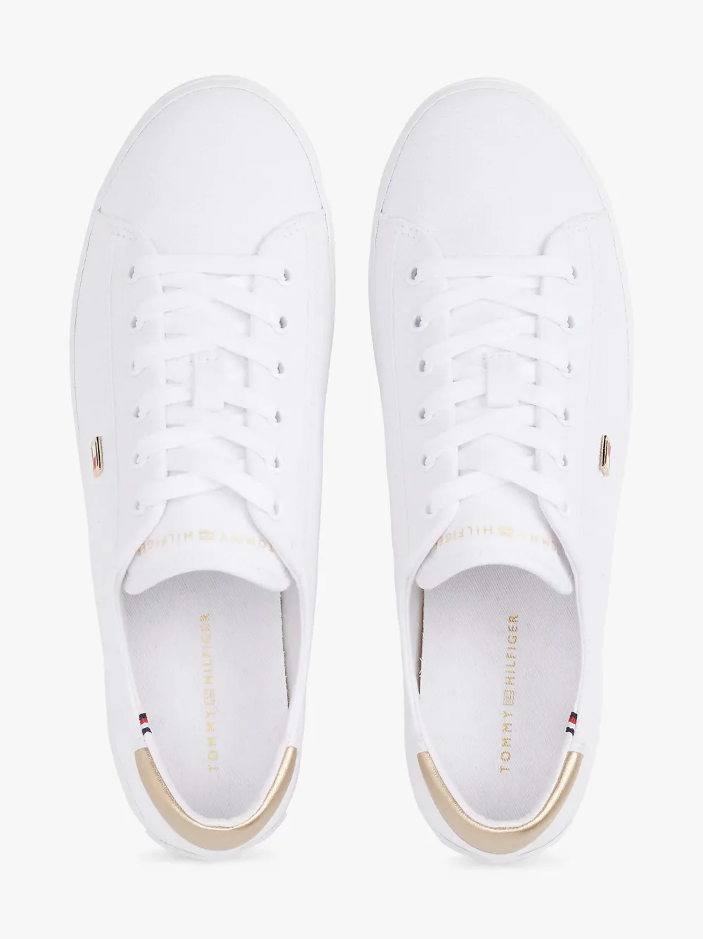 Yhdistä klassinen tyyli ja moderni säihke näissä Tommy Hilfigerin Canvas Metallic Heel Trainers -lenkkareissa. Nämä matalavartiset tennarit on valmistettu 100 % puuvillakankaasta, ja niissä on vulkanoitu kumipohja, joka tarjoaa kestävyyttä ja mukavuutta. Metallinen kantapääkoriste tuo hienostuneen lisän muuten minimalistiseen muotoiluun.