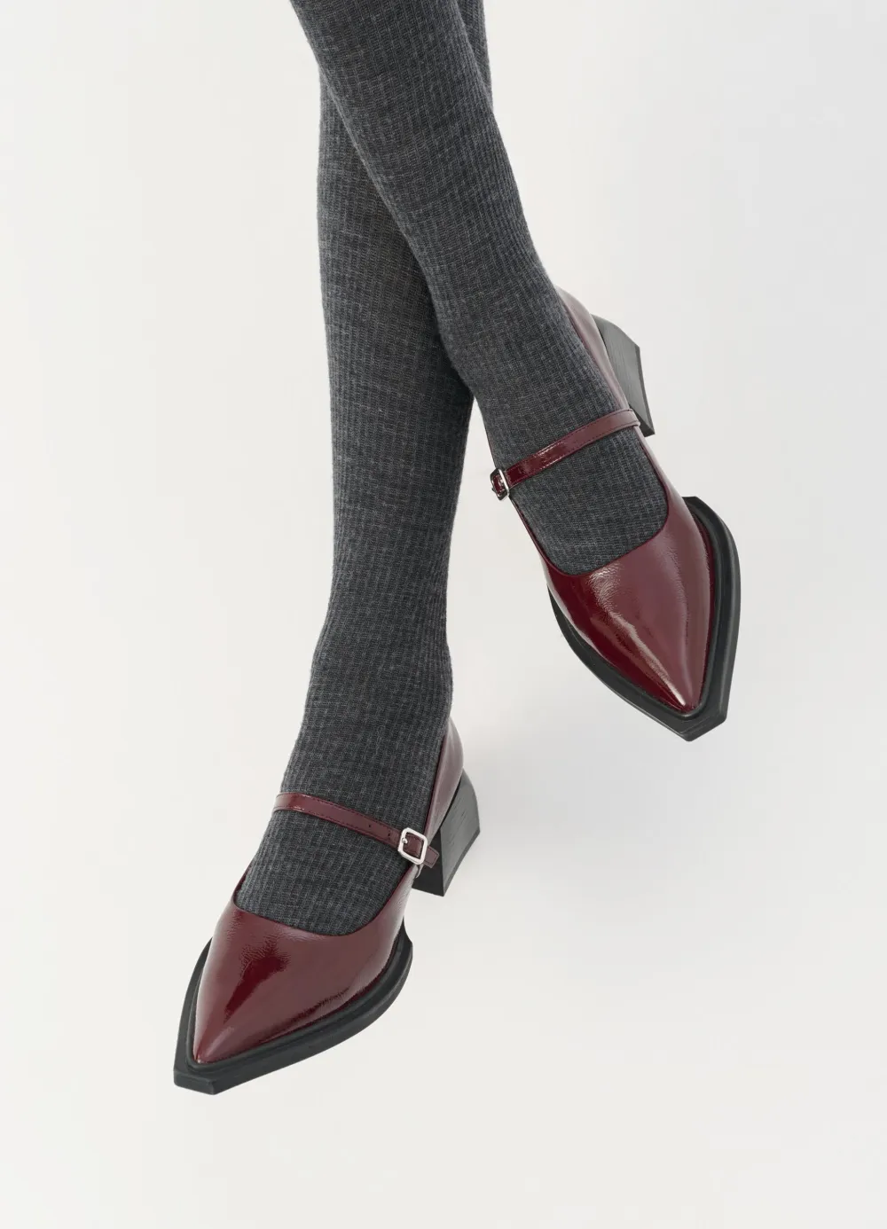 Yhdistelmä modernia ja juhlavaa. Vivian on Mary Jane kengät, jotka on valmistettu kirsikanpunaisesta patentoidusta nahasta. Mallissa on 55 mm veistokselliset tolppakorot. Yksityiskohtiin kuuluvat terävä kärki ja kromittomat nahkavuori sekä nahkapohjalliset.