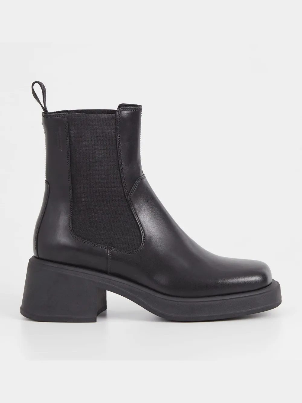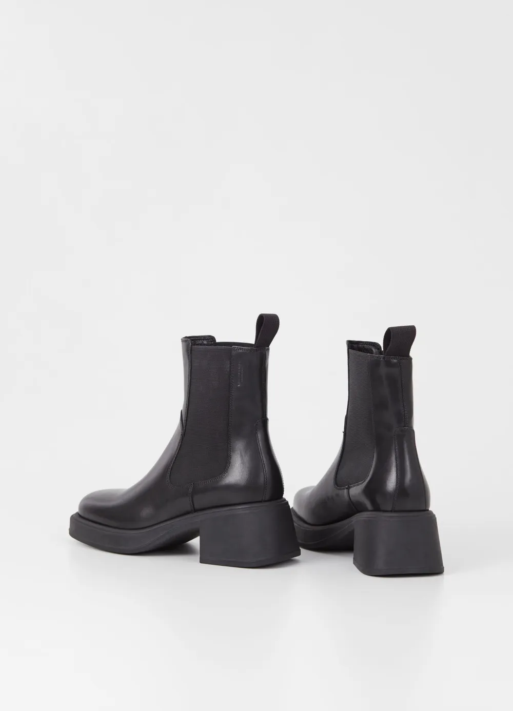 Dorah on modernit Chelsea-saappaat arkiseen käyttöön. Mustasta nahasta valmistetussa tyylissä on neliskanttiset kärjet, joustavat sivupaneelit ja vetolenkit. Paksut tolppakorot ovat 59 mm.
