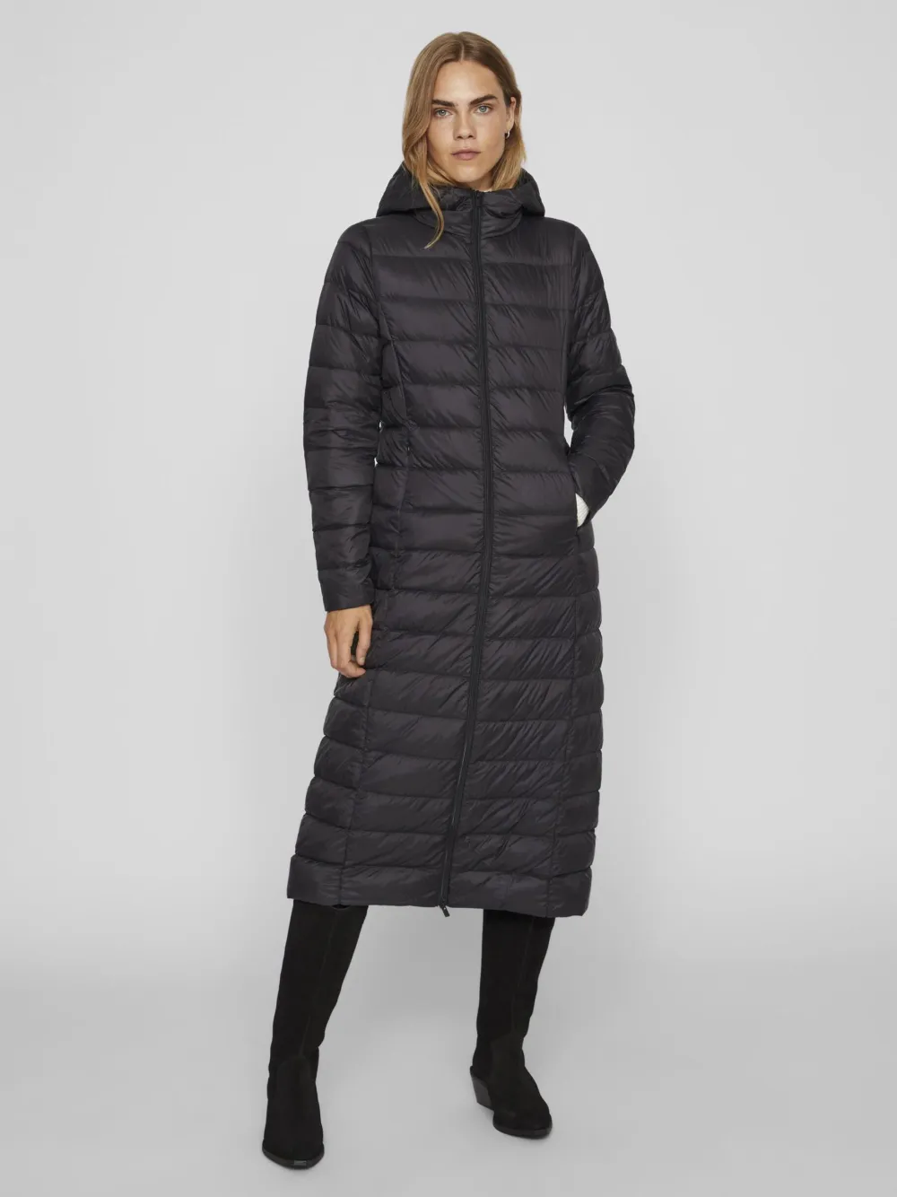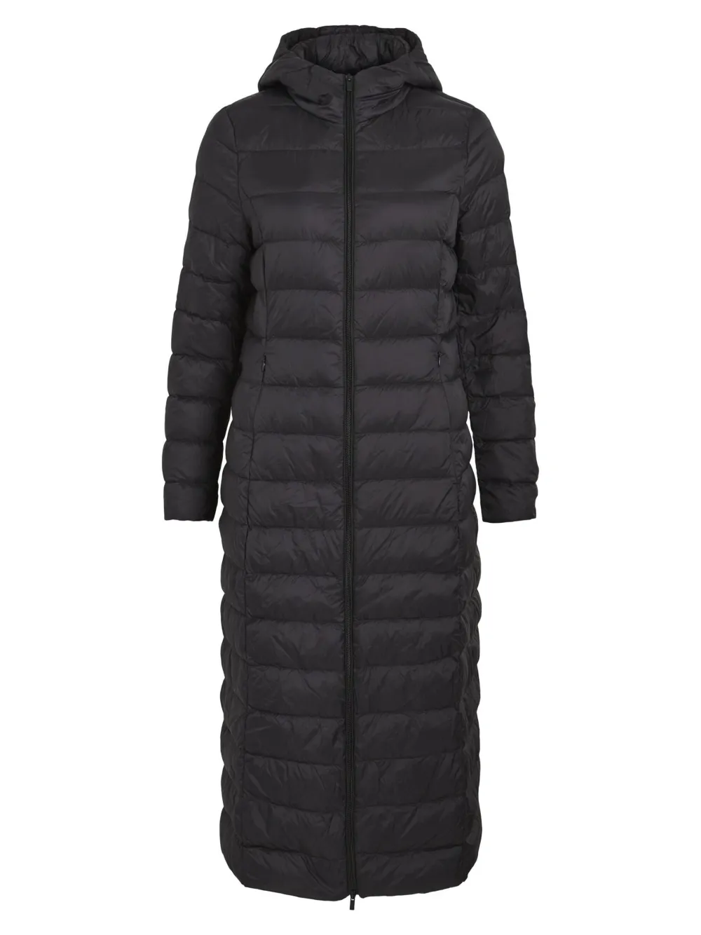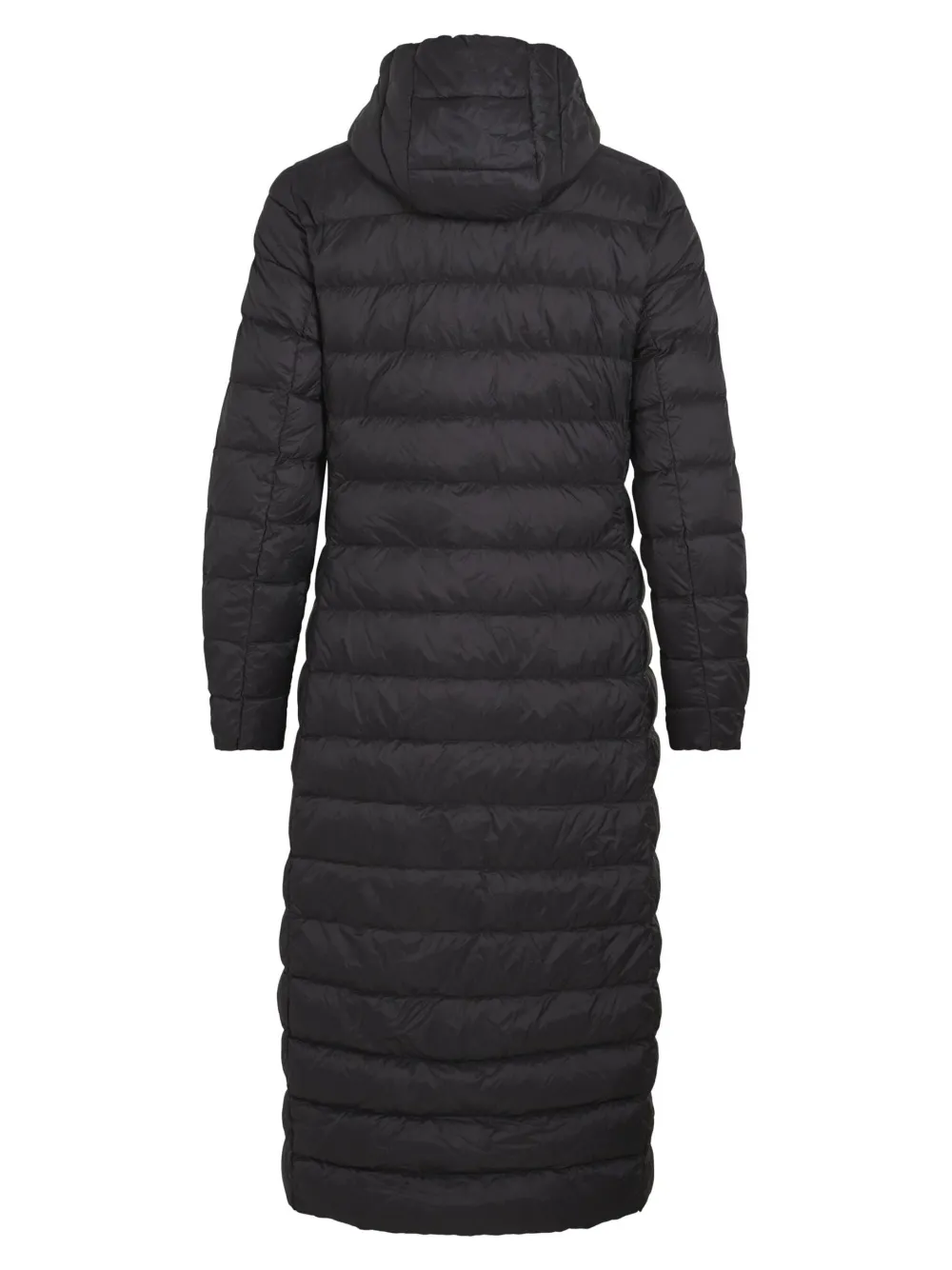 Naisten pitkä hupullinen untuvatakki. Takissa edessä sivuilla taskut. Takin vetoketju kaksisuuntainen.