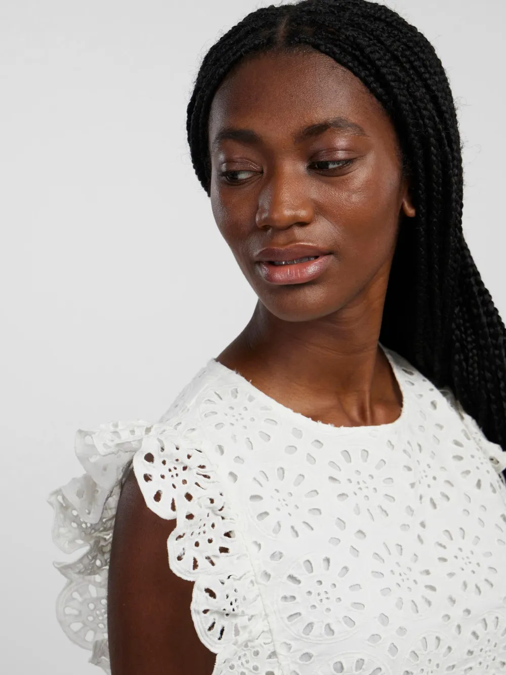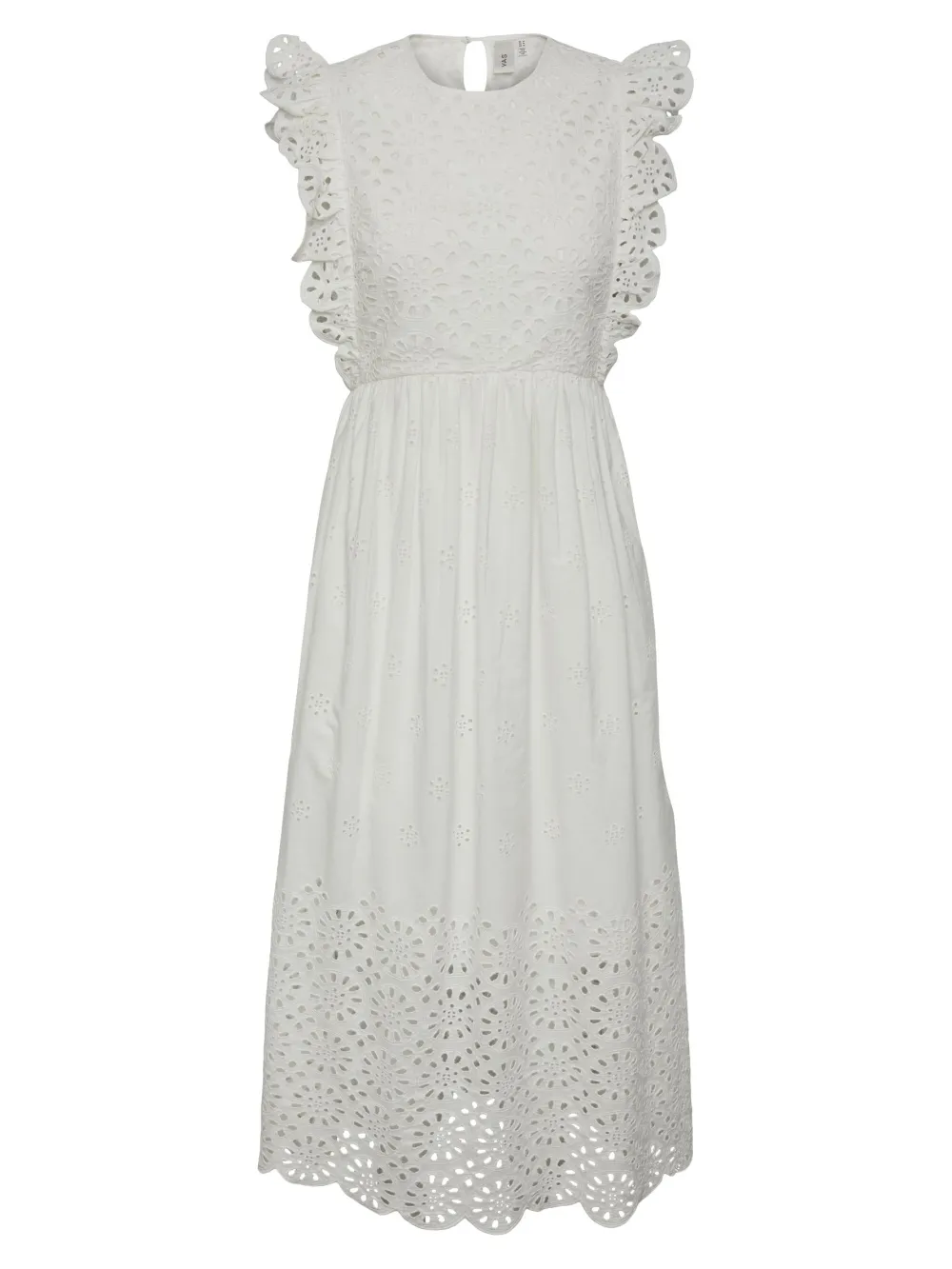 Lisäyksityiskohdat: Vyötäröllä leikkauslinja, röyhelöt naiselliseen reunaan, Broderie anglaise -yksityiskohta